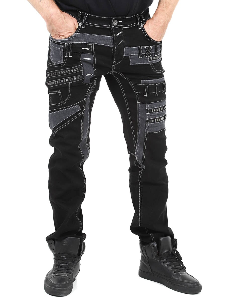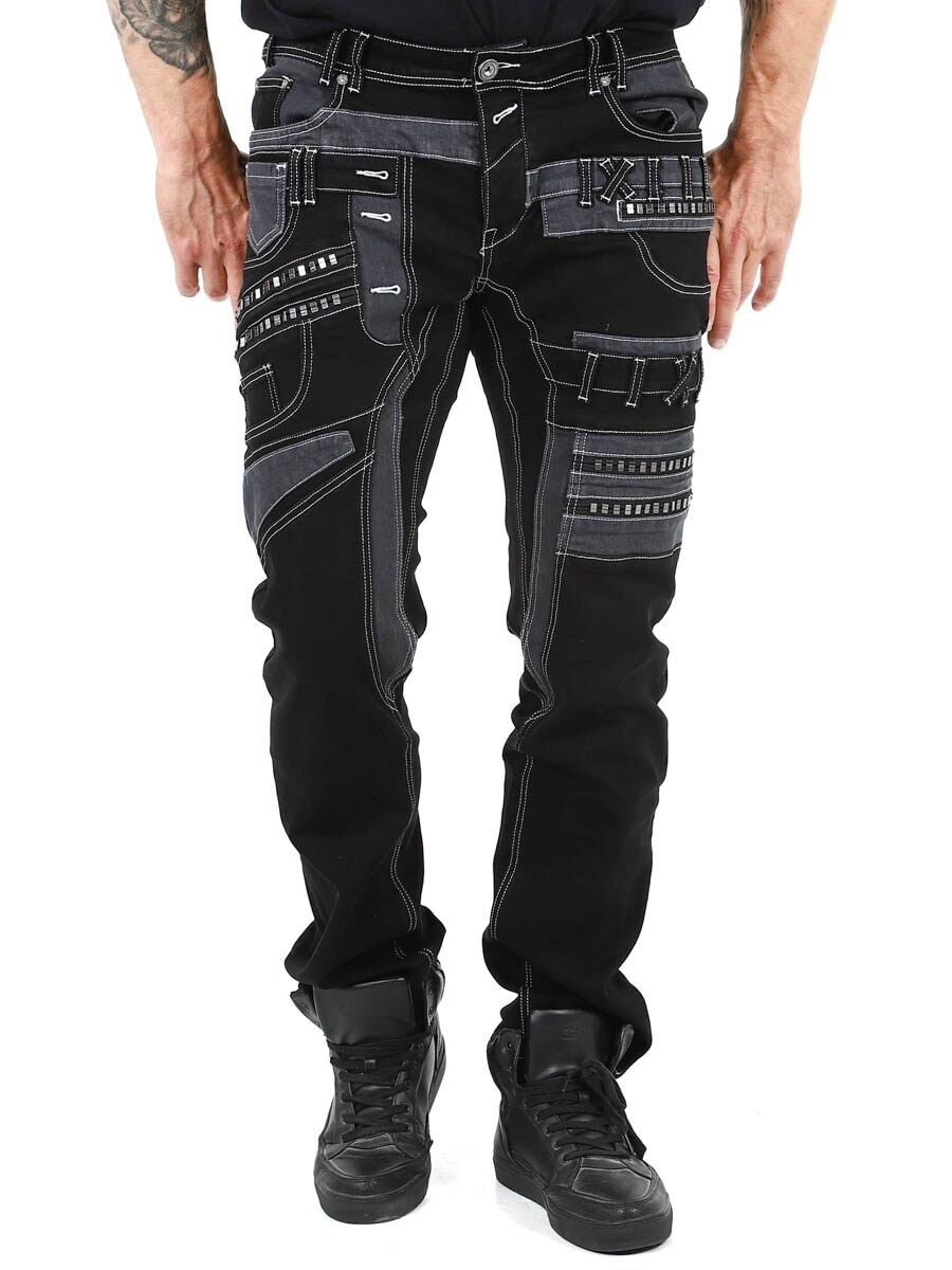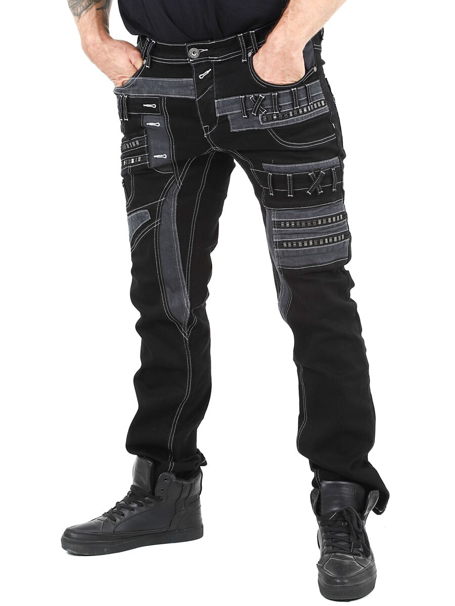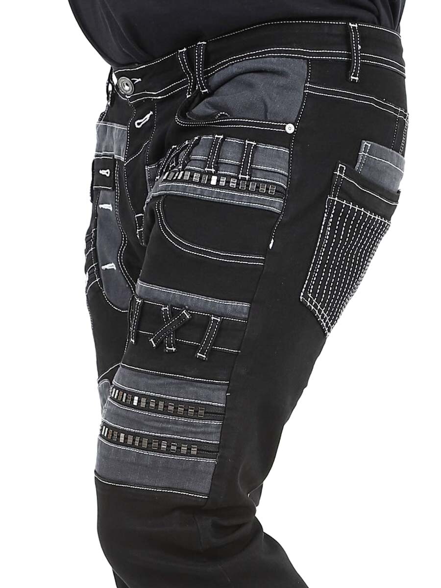 Gi antrekket ditt en mørkere kant med disse unike, svarte stretchjeansene. Designet med glidelåser, sømmer og paneler for en dristig look. Perfekt for deg som vil ha noe utenom det vanlige.