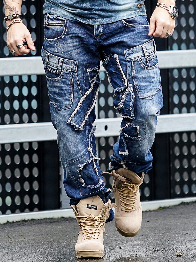 Mellomblå bukse i kraftig denimmateriale med effekter som rifter, ekstra lommer, stropper, grove sømmer og glidelåser. De har en normal passform og mange kiler i midjen.
