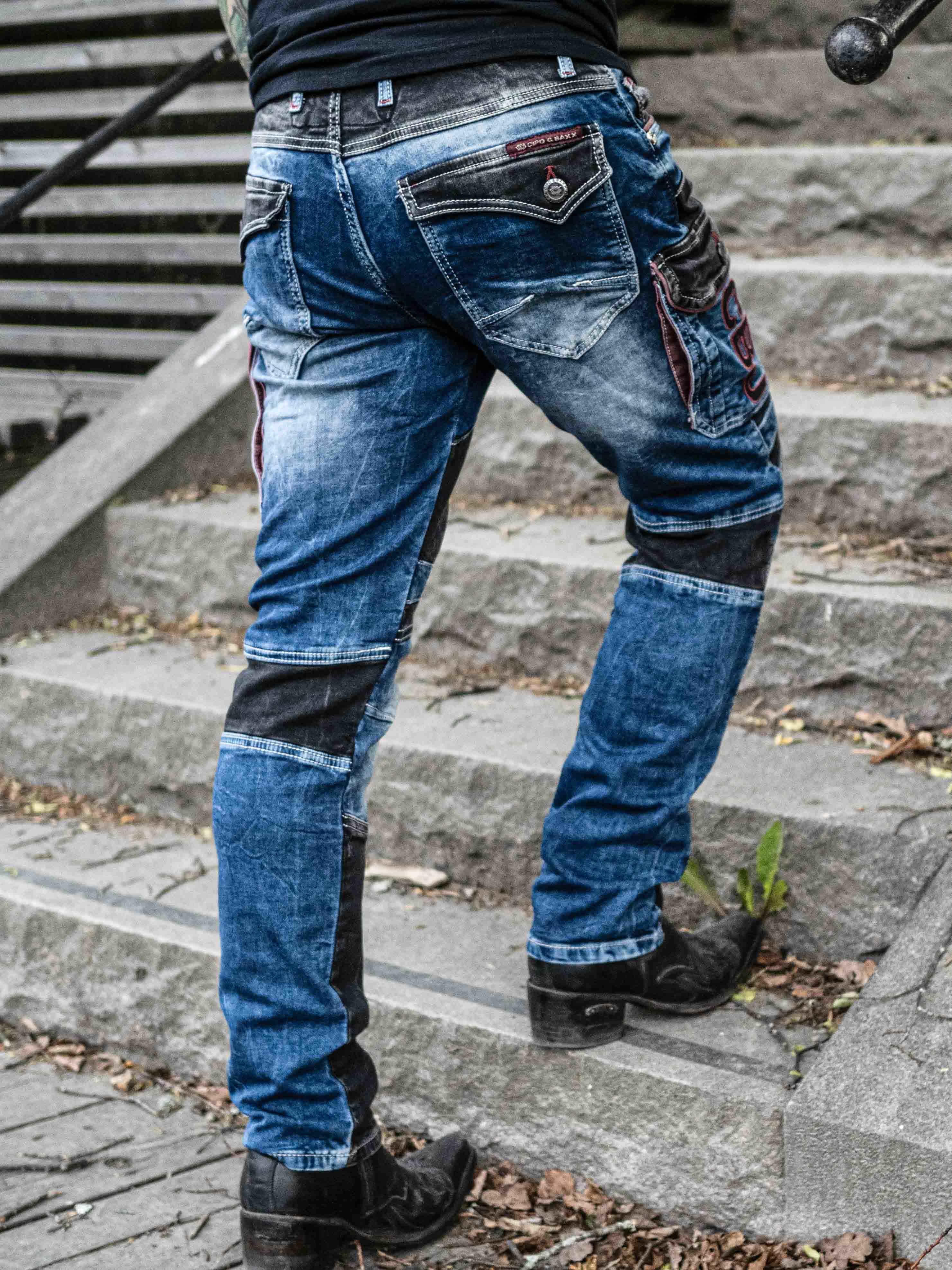 Tøffe jeans med detaljer i svart og rødt. De har flere lommer, beltestropper i livet og logo. Unike jeans som får deg til å skille deg ut fra mengden!