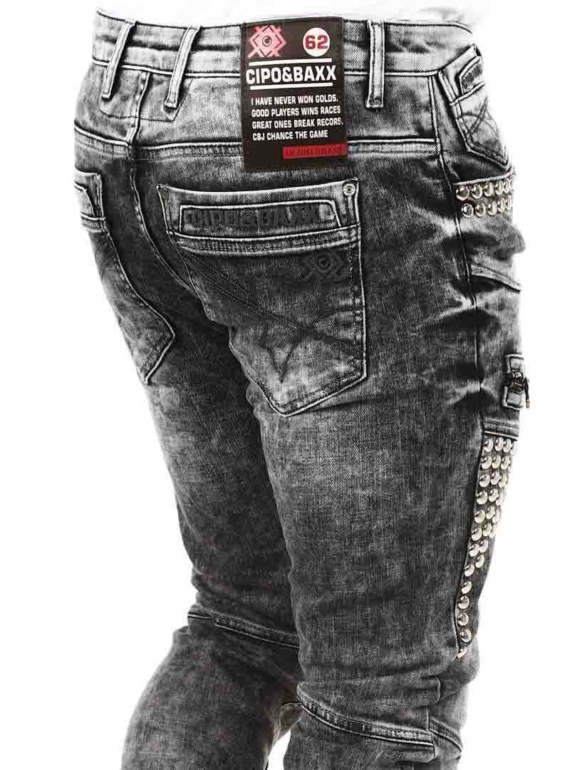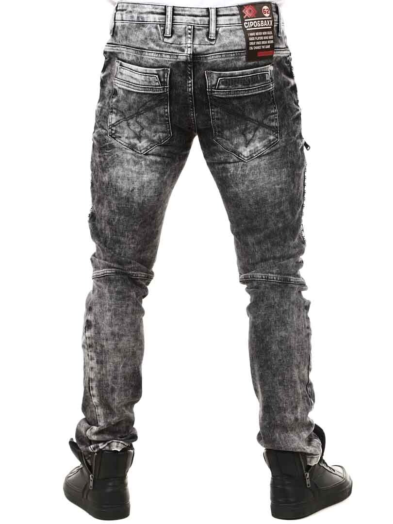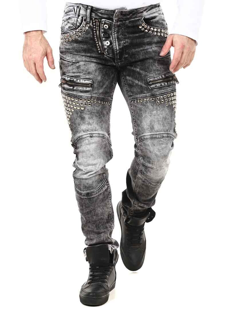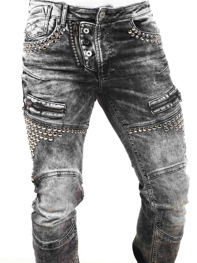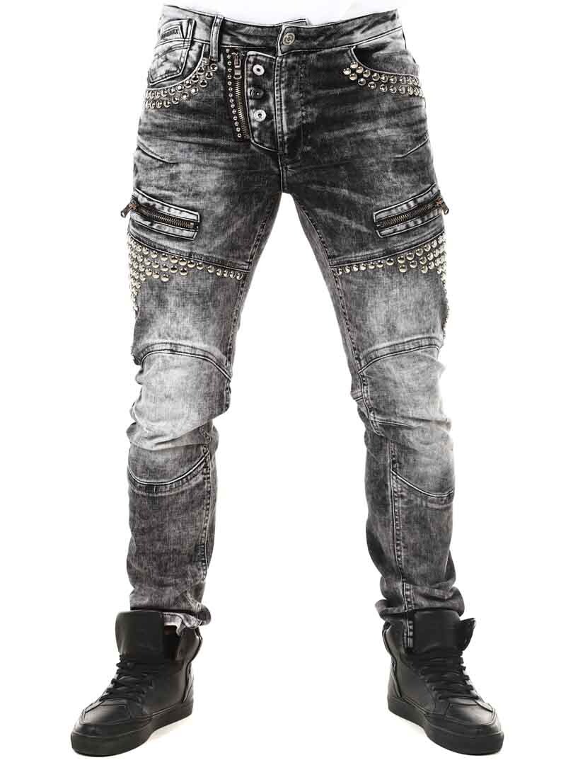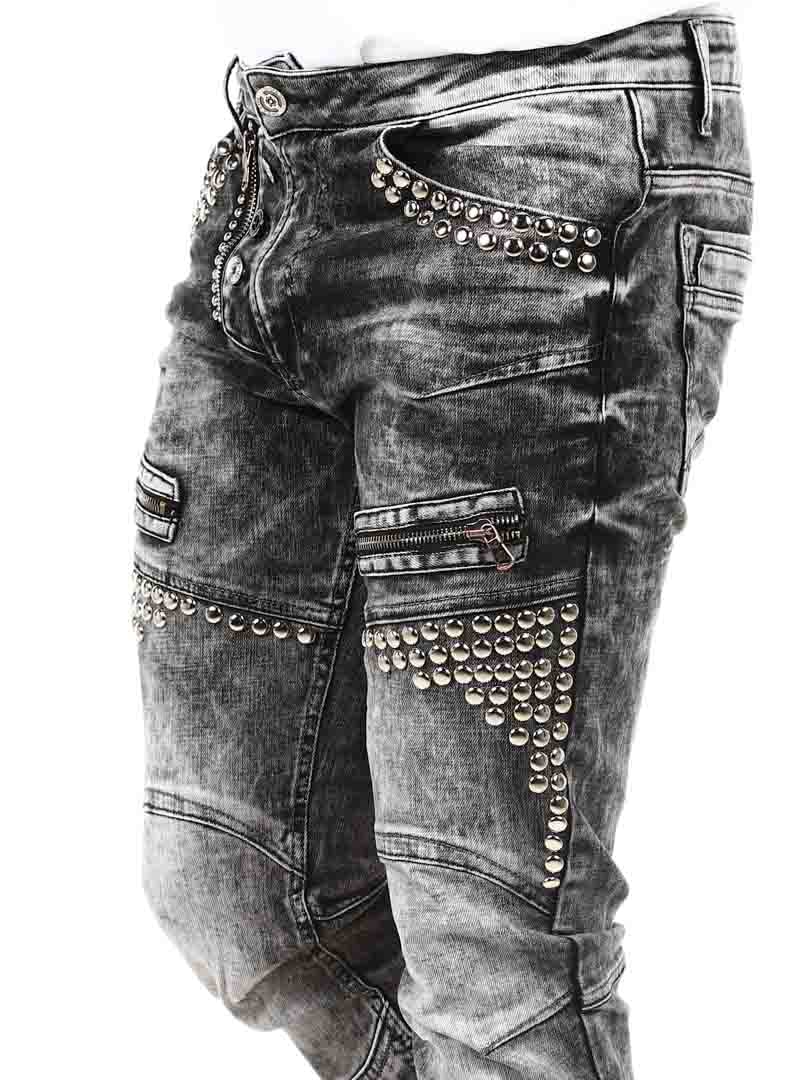 Tøffe bukser i stretchy denim. Rock designet med nagler, glidelåser og highlight-sømmer. 5-lommers modell med både knapp og glidelås.