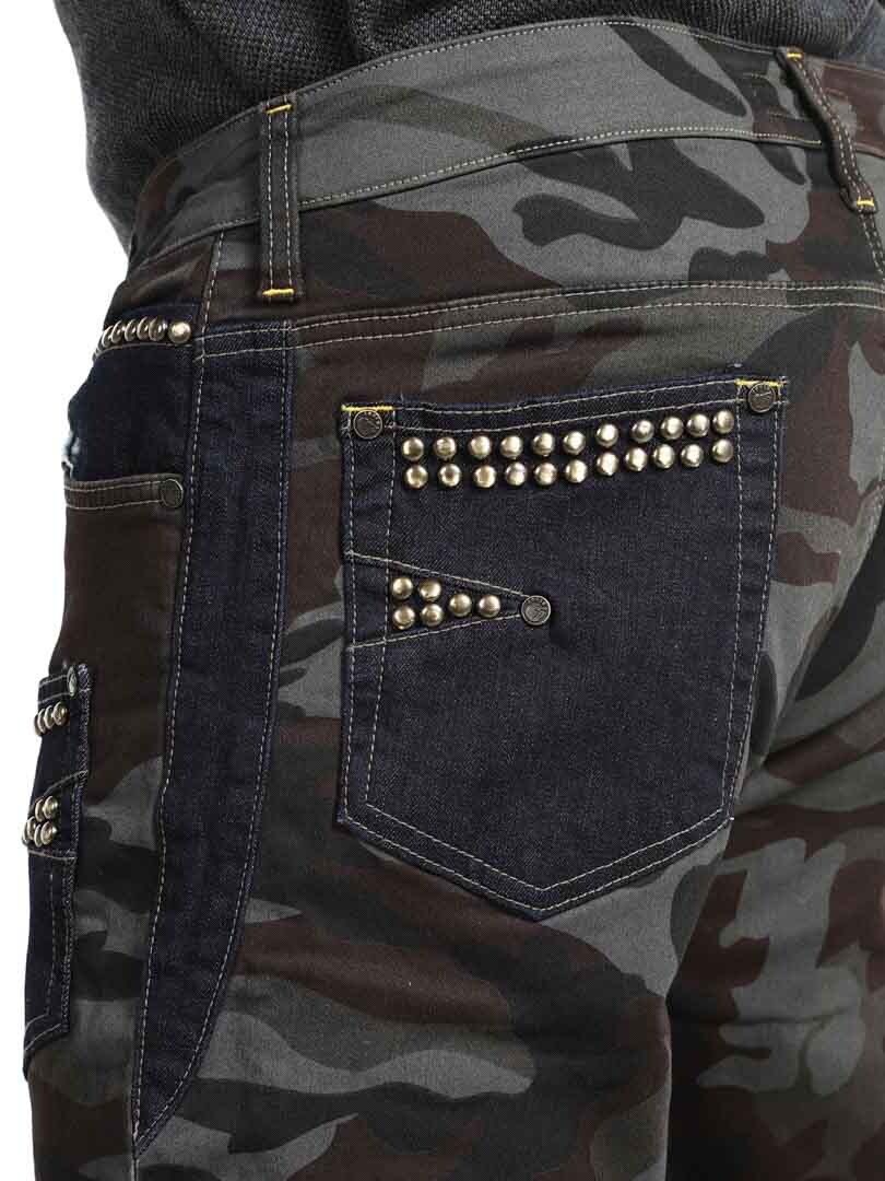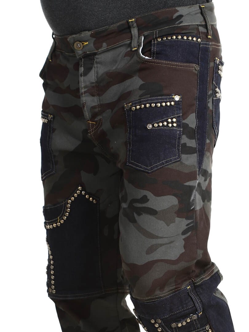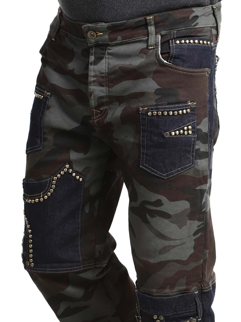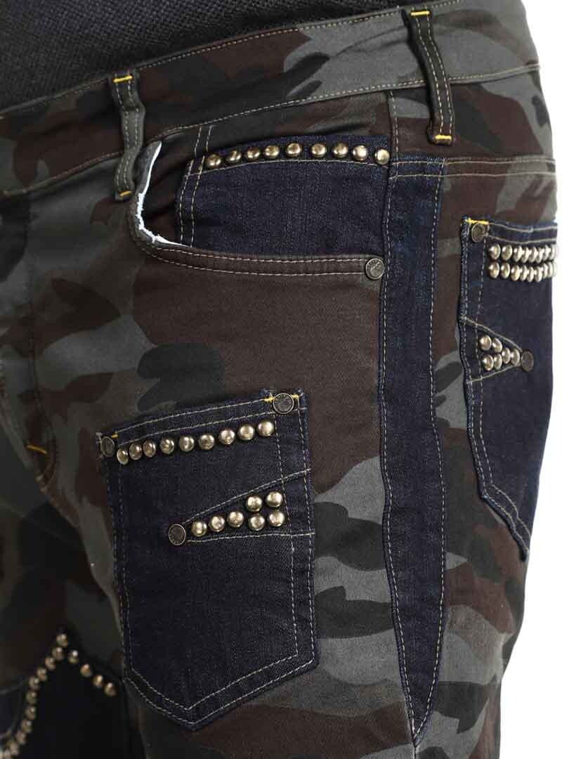 Disse buksene kombinerer et militærmønstret design med kontrasterende denimpaneler og dekorative nagler for en rå og iøynefallende stil. De har flere funksjonelle og stilige lommer. Den stretchy passformen gir komfort og bevegelsesfrihet, mens buksene er perfekt for de som vil skille seg ut med en edgy look!