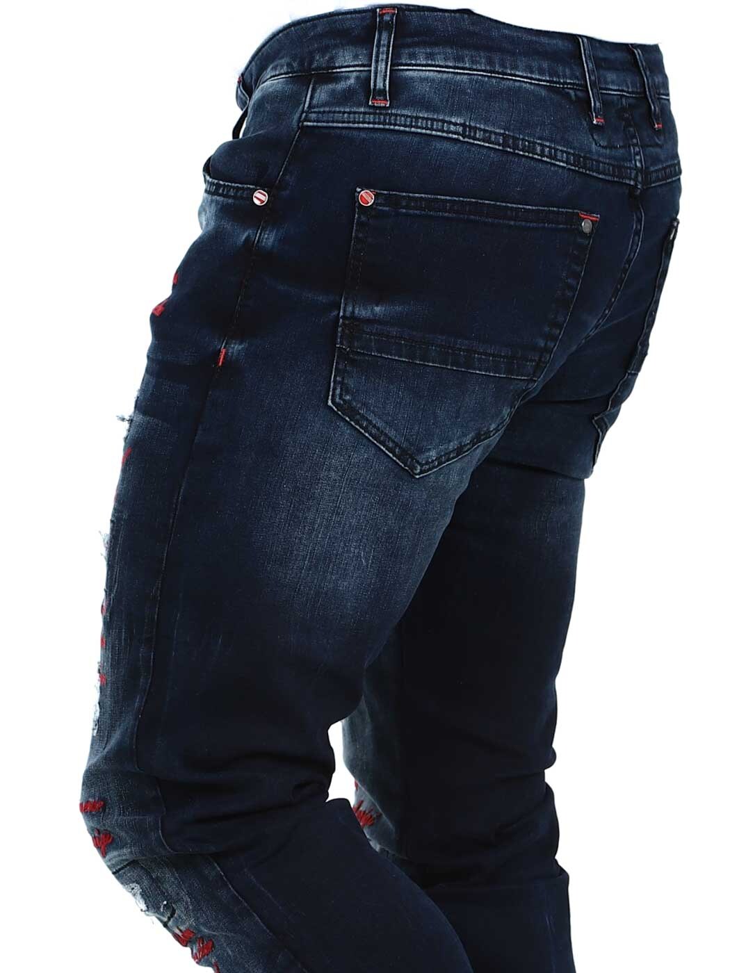Bukser i steinvasket denim med rifter. Designet med røde detaljer og skreddersydd tekst som gir et unikt utseende. Elastisk modell med fem klassiske lommer.
