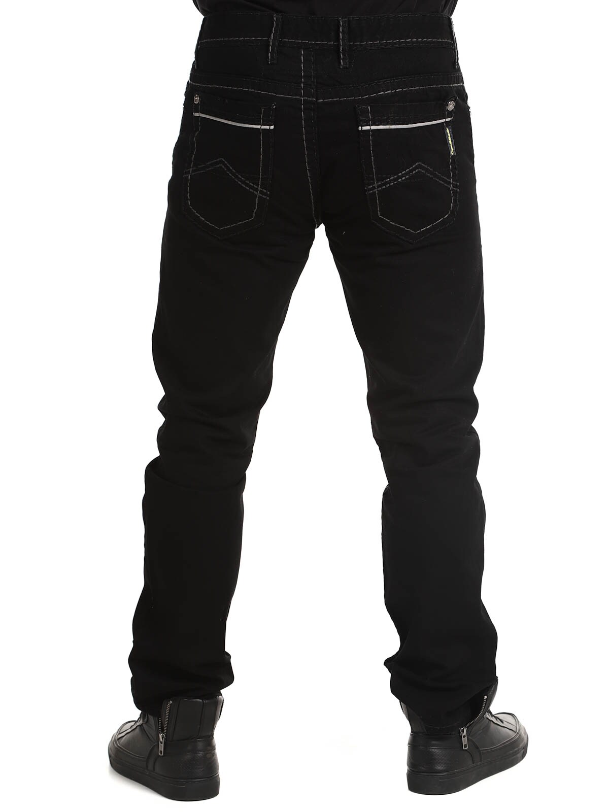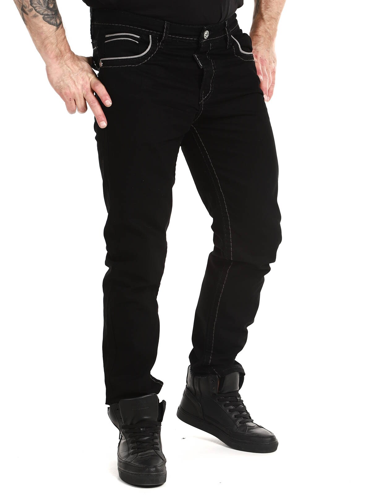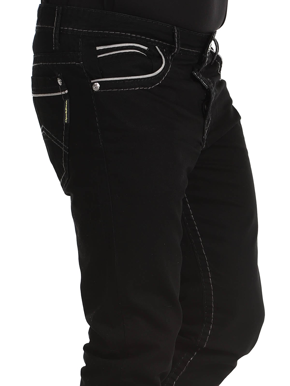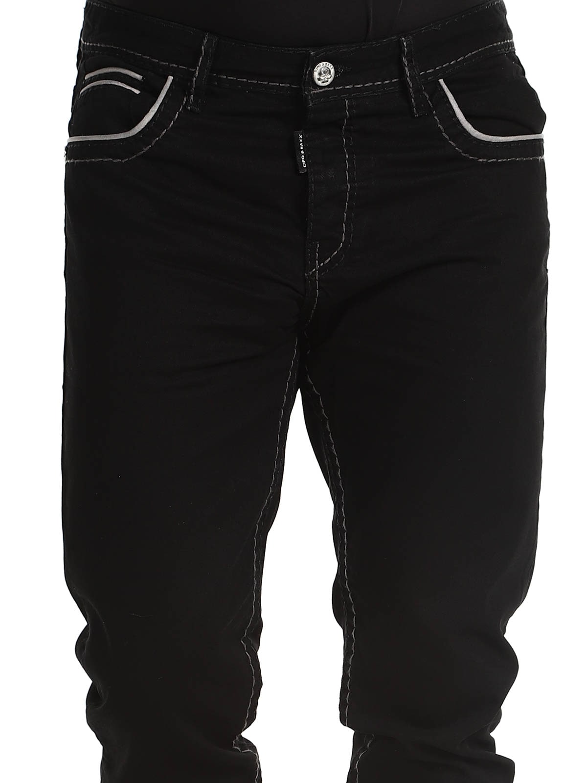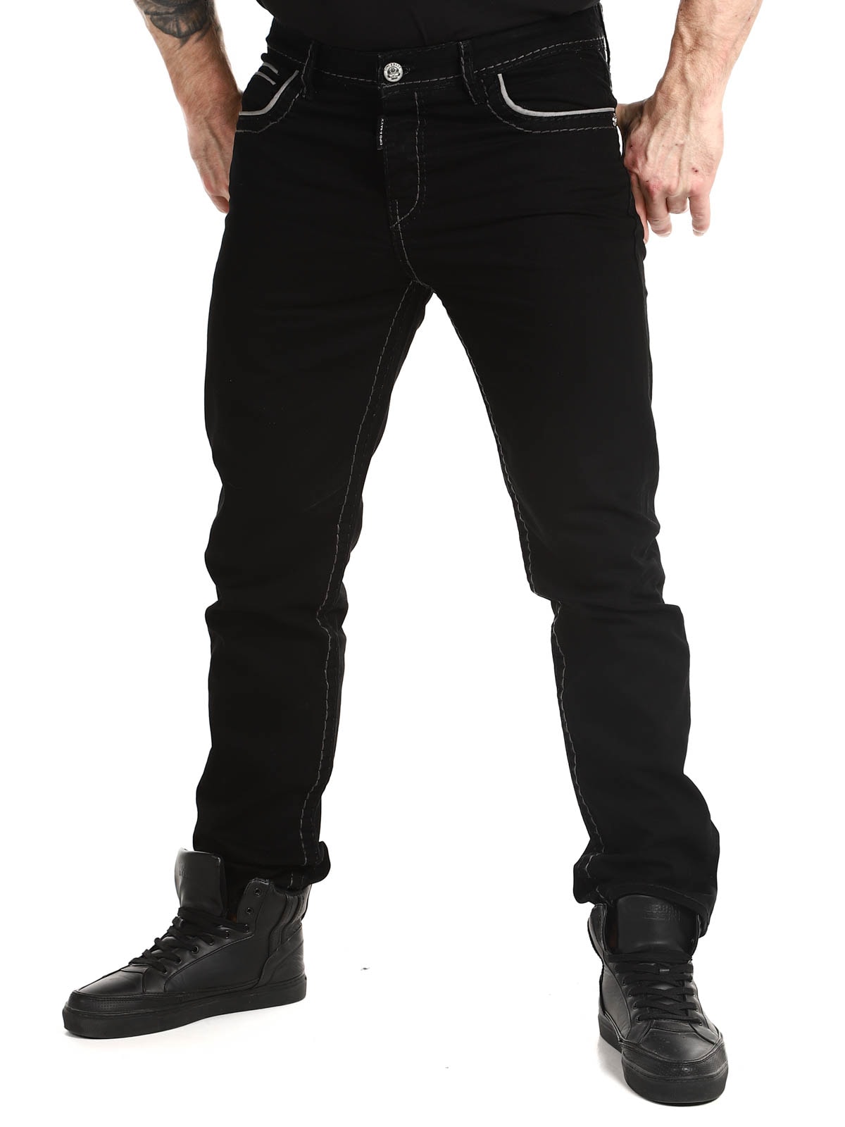 Svarte jeans i klassisk passform med grove sømmer i kontrastfarger. De har fire frontlommer og to baklommer. Stilige bukser som passer til det meste!