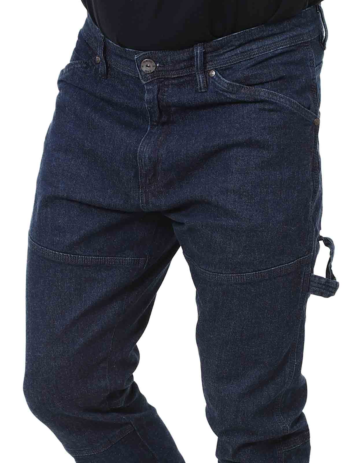 Bukser i mørkeblå denim med grove sømdetaljer. De har en smal passform som sitter komfortabelt takket være lett stretch i stoffet. Designen kombinerer en klassisk femlommersmodell med en ekstra detalj bak for et unikt uttrykk.