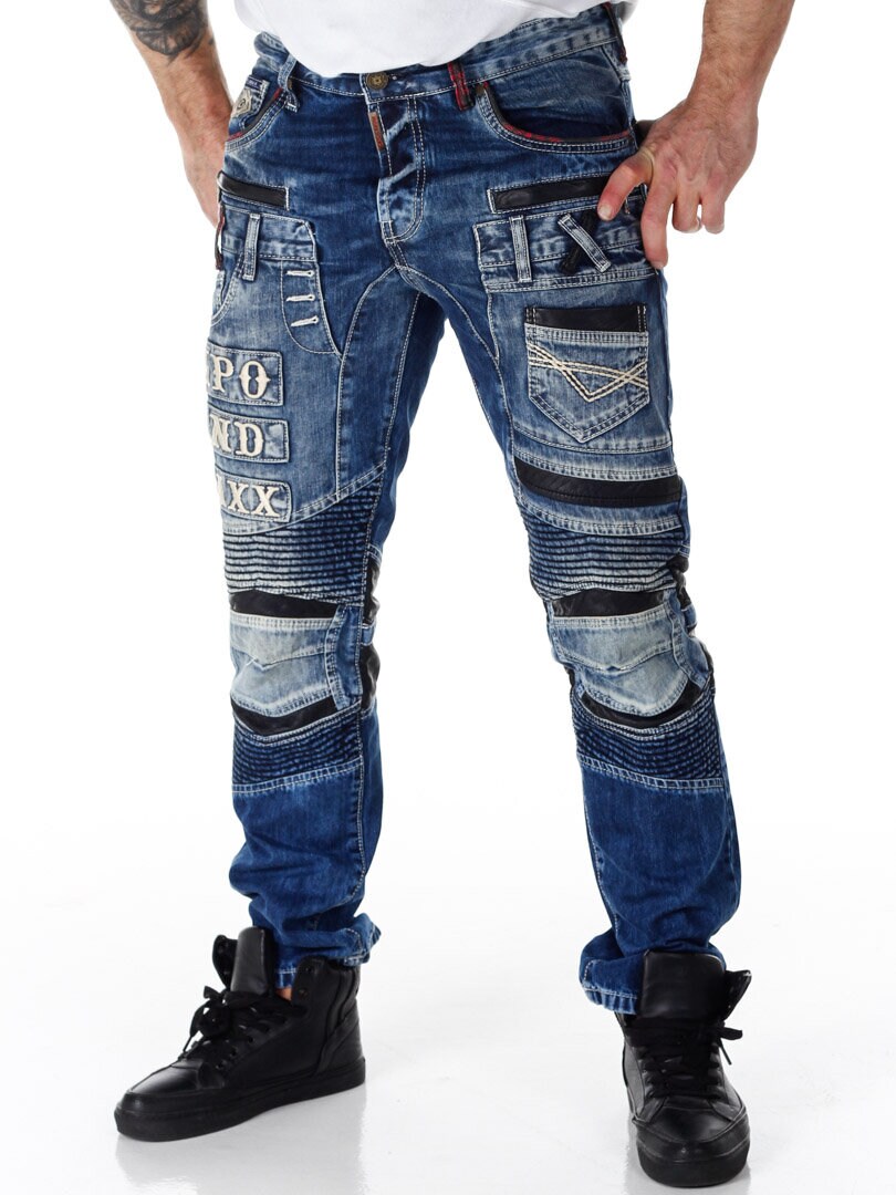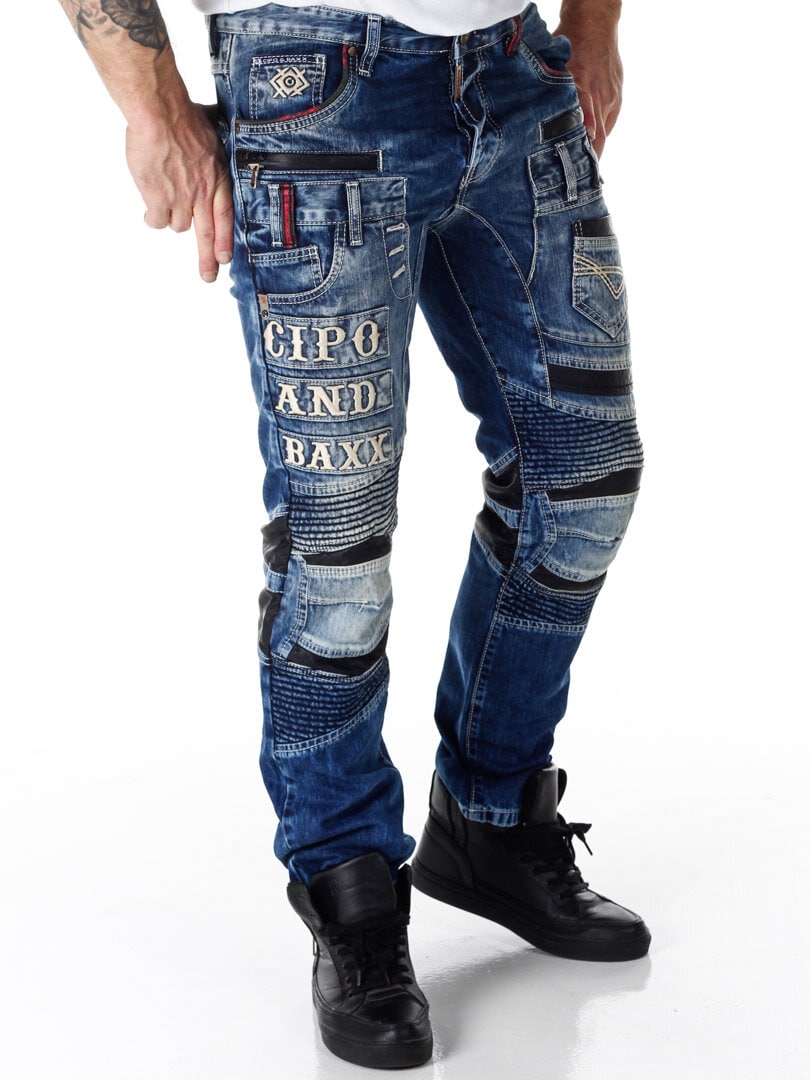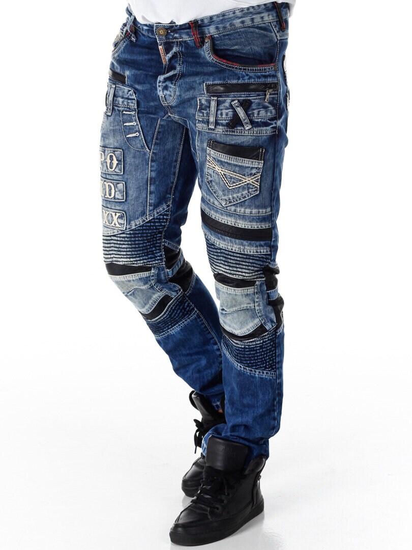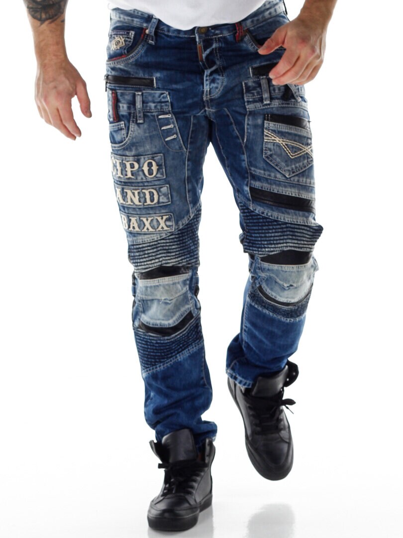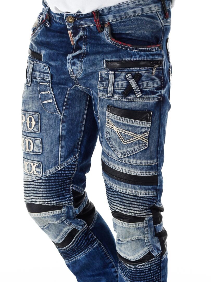 Bukser i vasket denim med tøff design. De har klassisk passform og mange lommer. Detaljert med partier i skinnimitasjon, glidelåser og brodert logo.