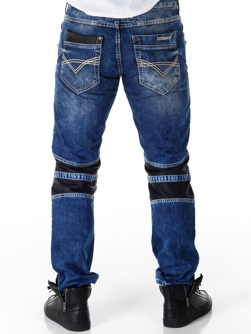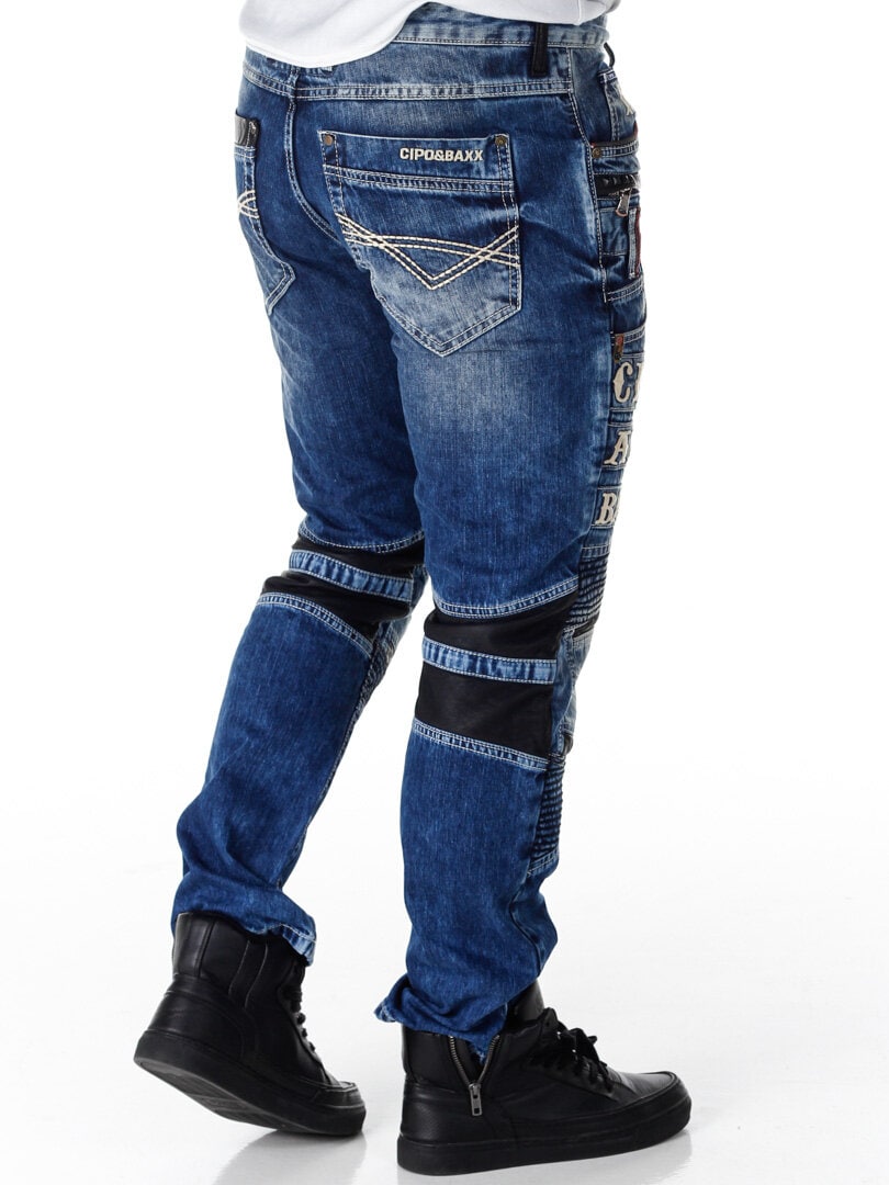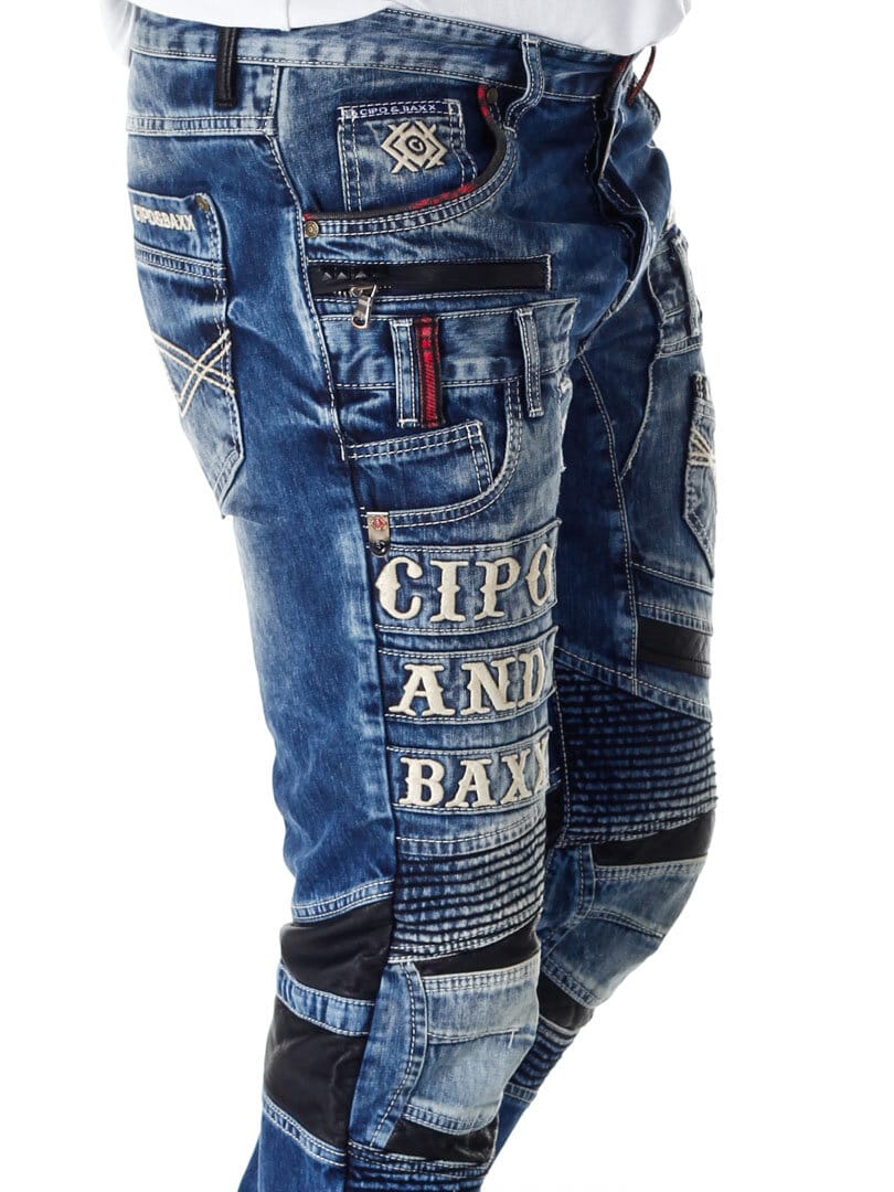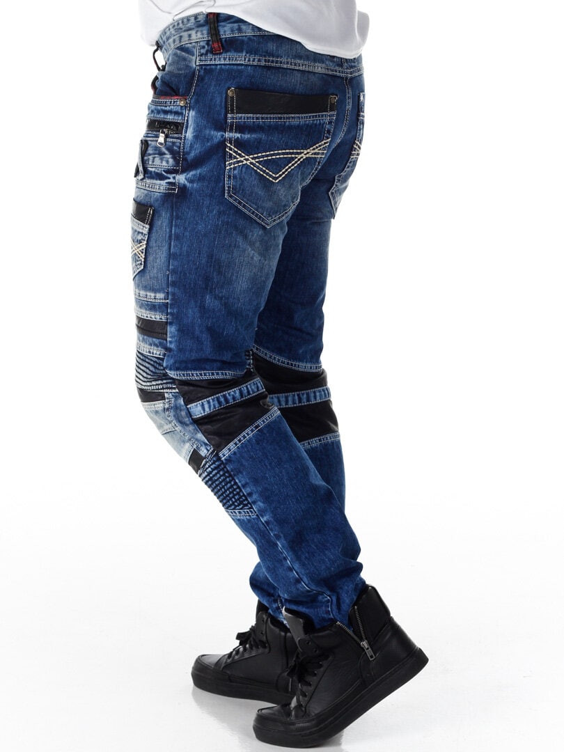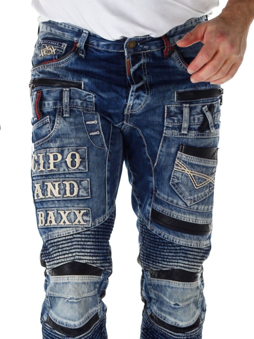 Bukser i vasket denim med tøff design. De har klassisk passform og mange lommer. Detaljert med partier i skinnimitasjon, glidelåser og brodert logo.