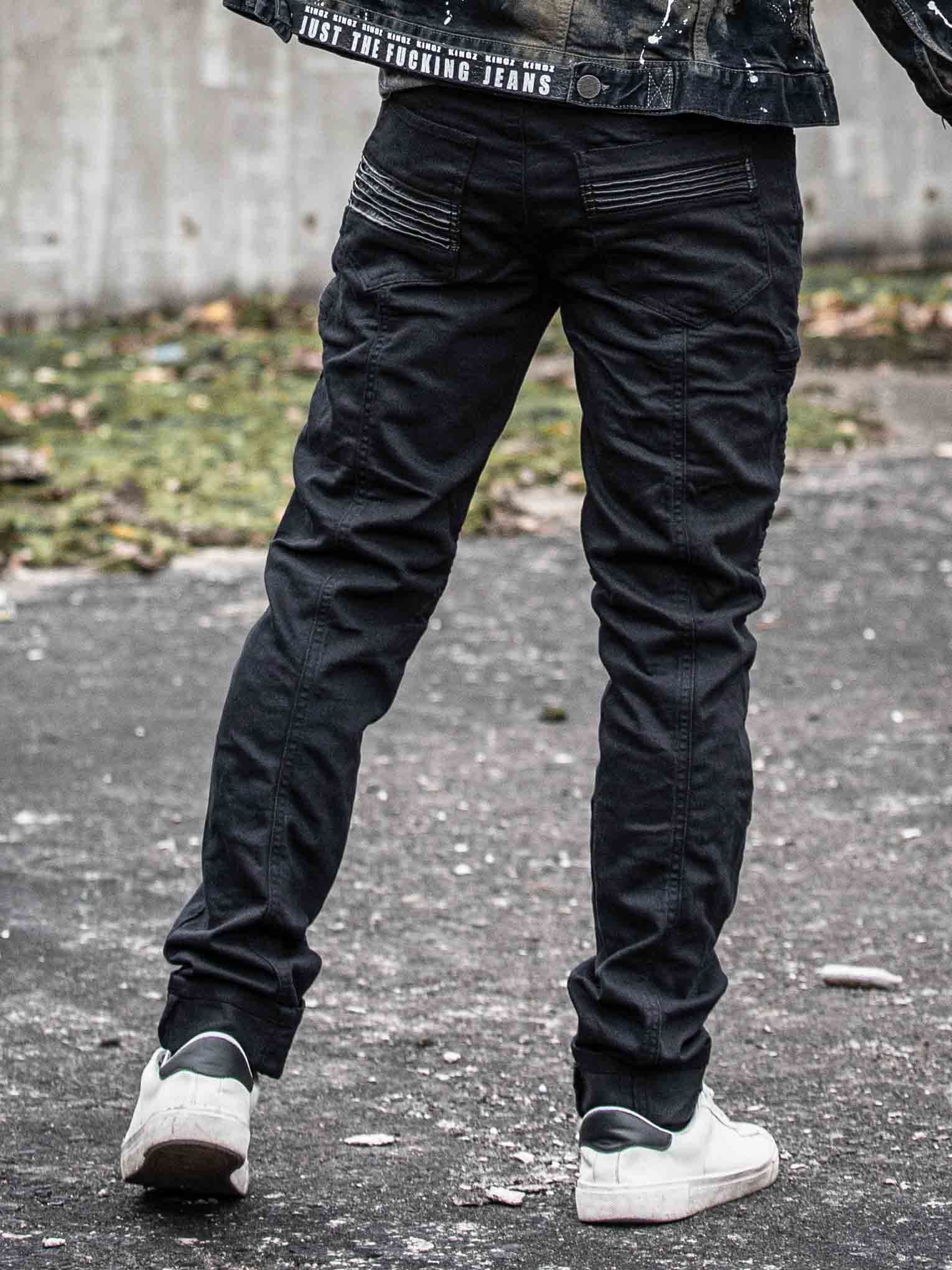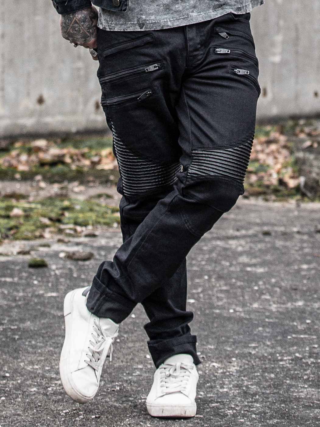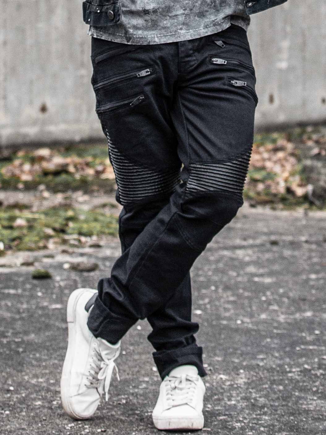 Unike jeans med skinnimitasjon på lårene og baklommene. Detaljert med tøffe glidelåser foran på lårene. Stretchy modell med to lommer foran, to baklommer og knapper i gylfen.