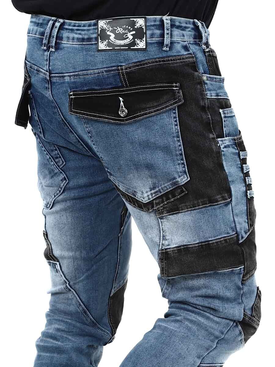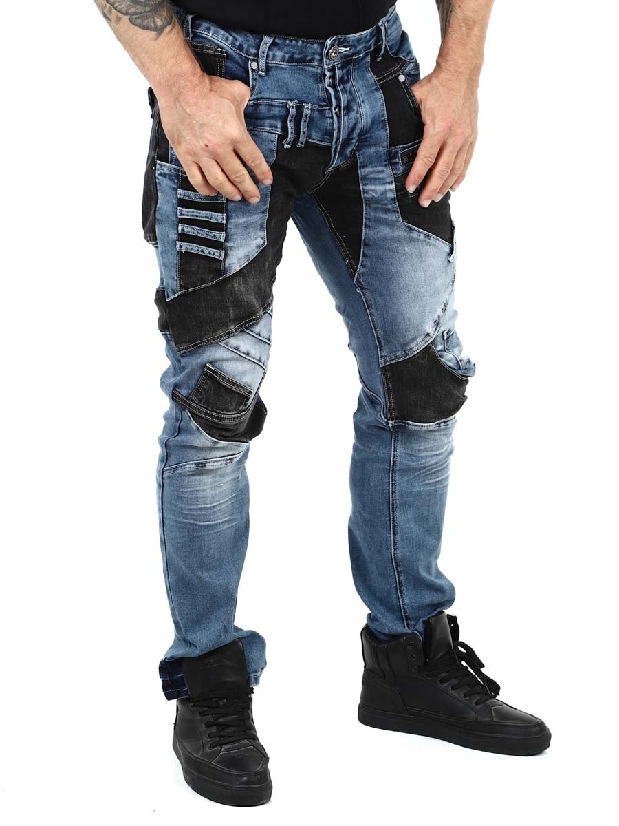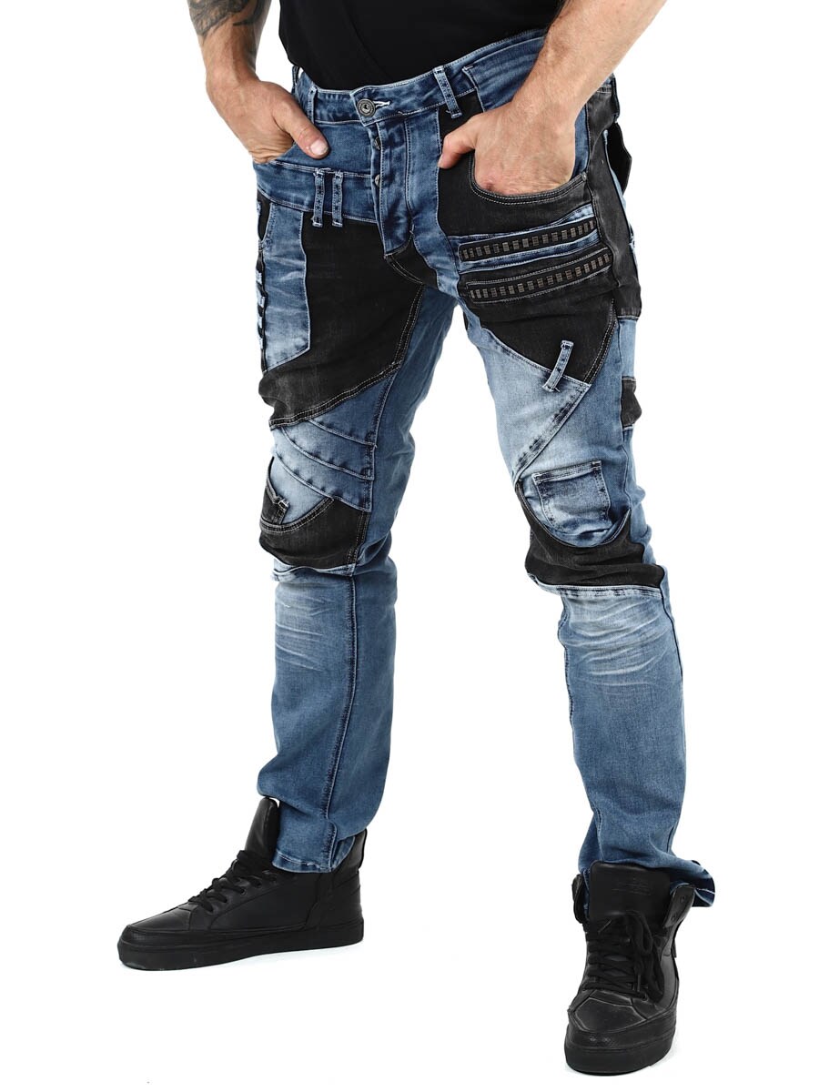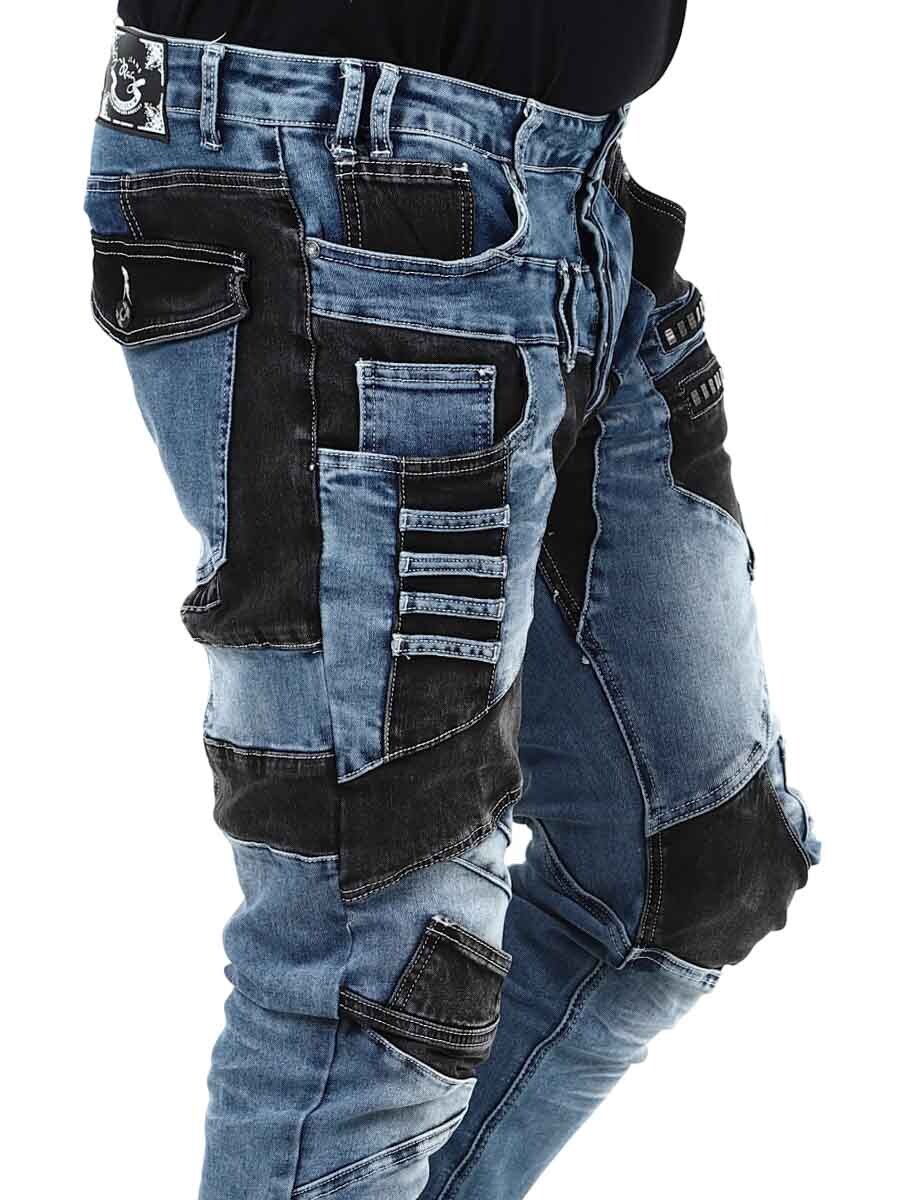 Disse unike jeansene kombinerer klassisk blå denim med svarte kontrastpaneler for en moderne og selvsikker look. Designet med glidelåser, sømmer og metall lapper for en tøff look. Jeansene har mange lommer både foran og bak, samt beltestropper i midjen.