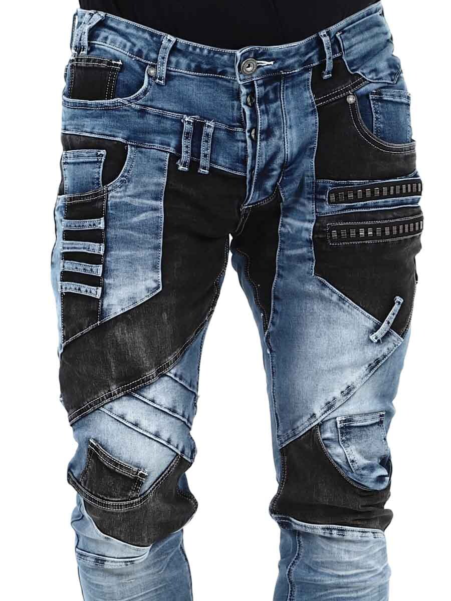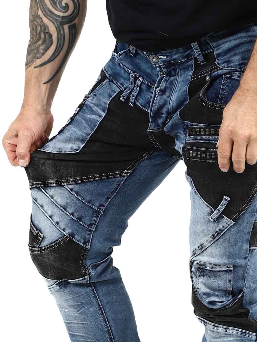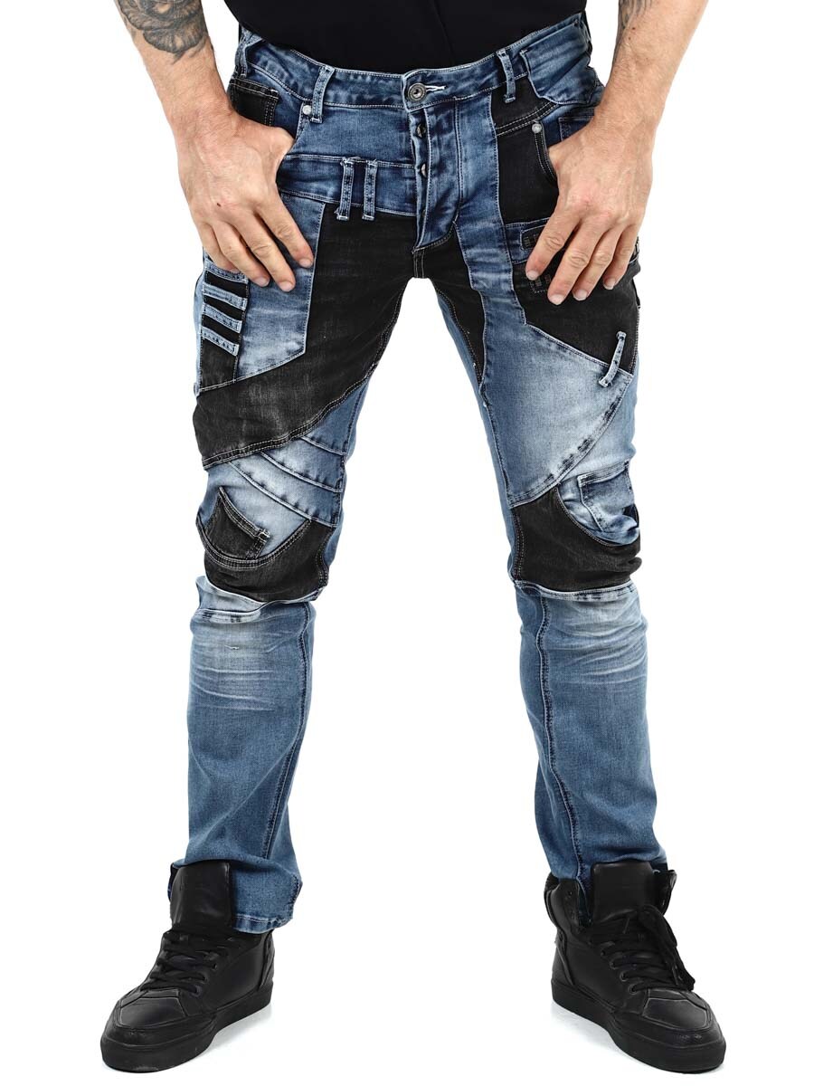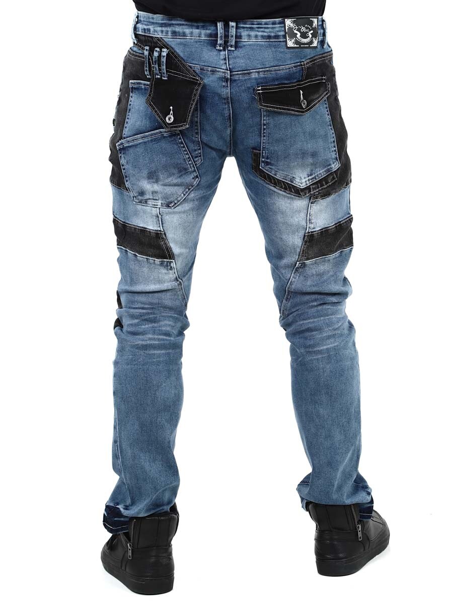Disse unike jeansene kombinerer klassisk blå denim med svarte kontrastpaneler for en moderne og selvsikker look. Designet med glidelåser, sømmer og metall lapper for en tøff look. Jeansene har mange lommer både foran og bak, samt beltestropper i midjen.