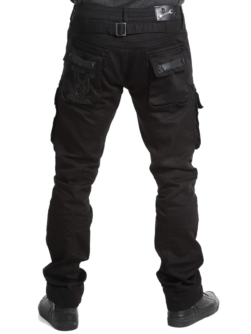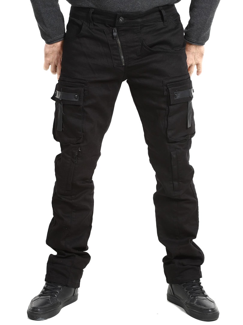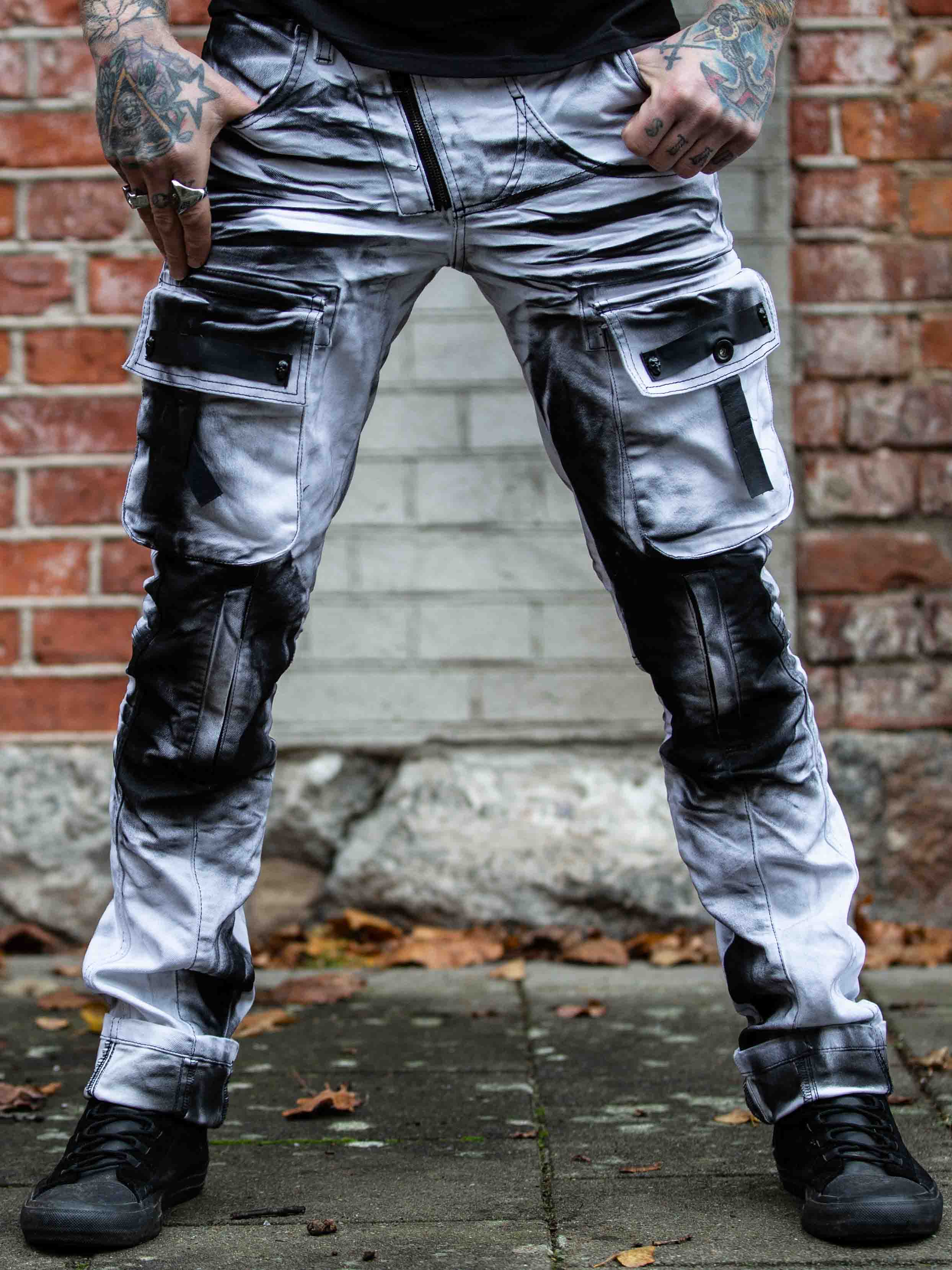 Unike jeans med flere lommer. Intrikat detaljert med hodeskallenagler, lærremmer og glidelåser på knærne. Jeansene lukkes med glidelåsgylf og har beltehemper i midjen.