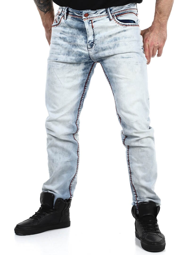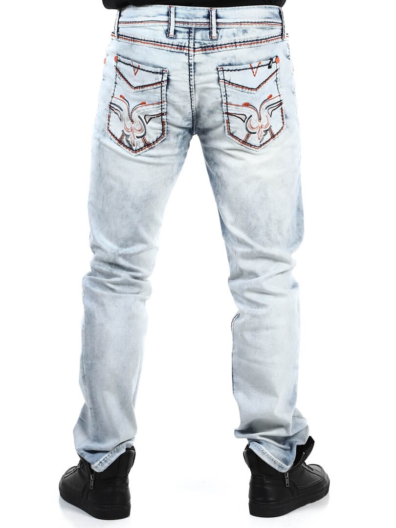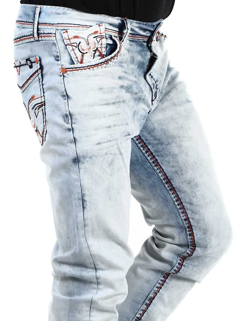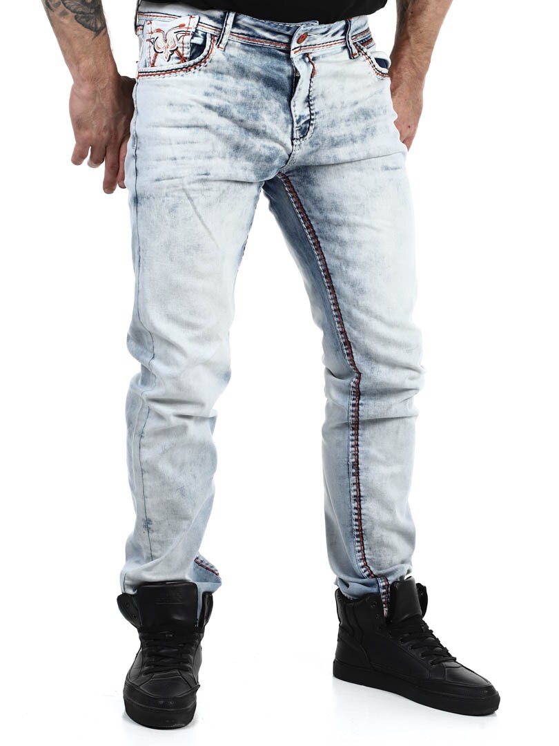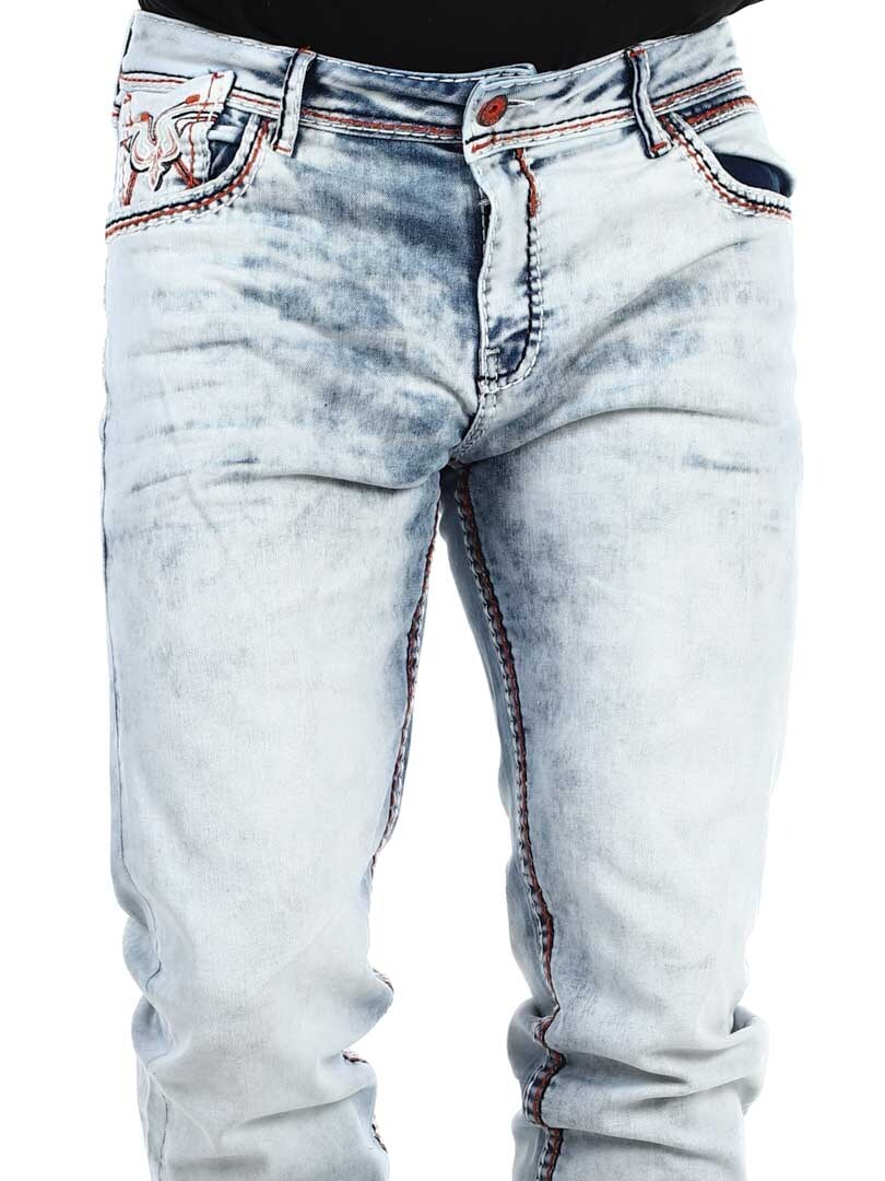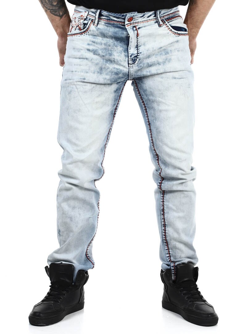 Bukser i vasket denimlook med dekorative kontrastsømmer for en kul og trendy look. Stretchy modell med tre lommer foran og to romslige baklommer med stilig brodering. Med disse jeansene får du en bukse som skiller seg ut fra mengden og passer både til hverdag og fest!