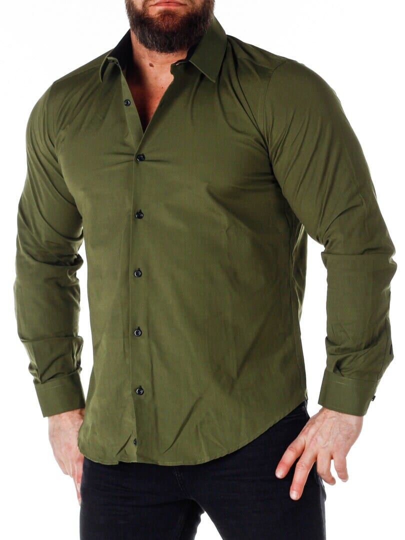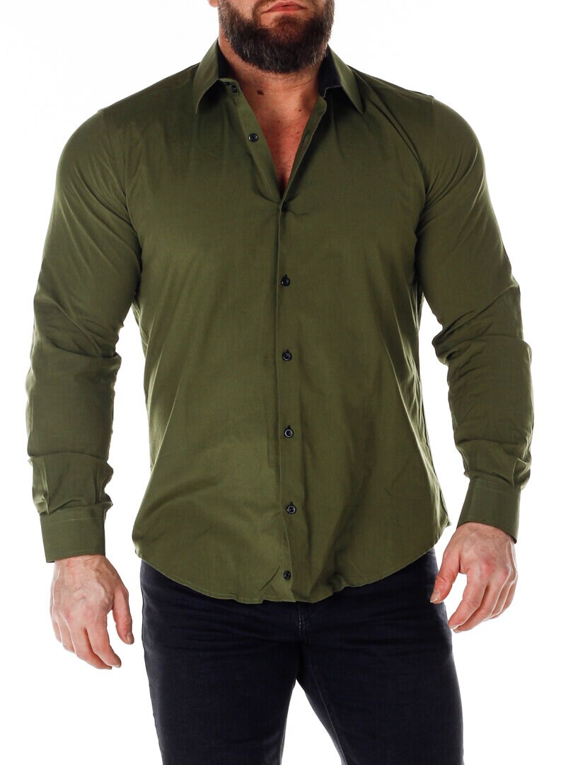 Bomullsskjorte i en behagelig modell som er lett stretchy. Grønn base med knapper, innerkrage og mansjetter i kontrastfarge. Slankere modell med avrundet linning nederst og forsterket krage som holder formen. Tilgjengelig i flere farger!