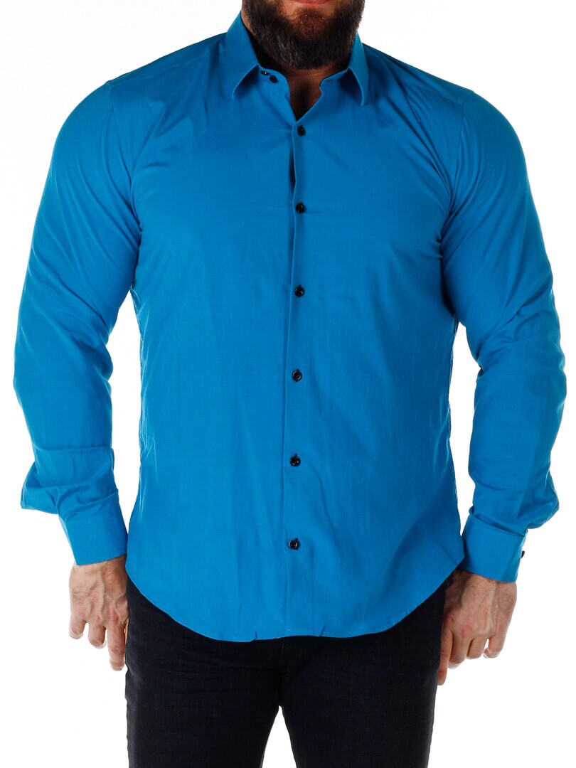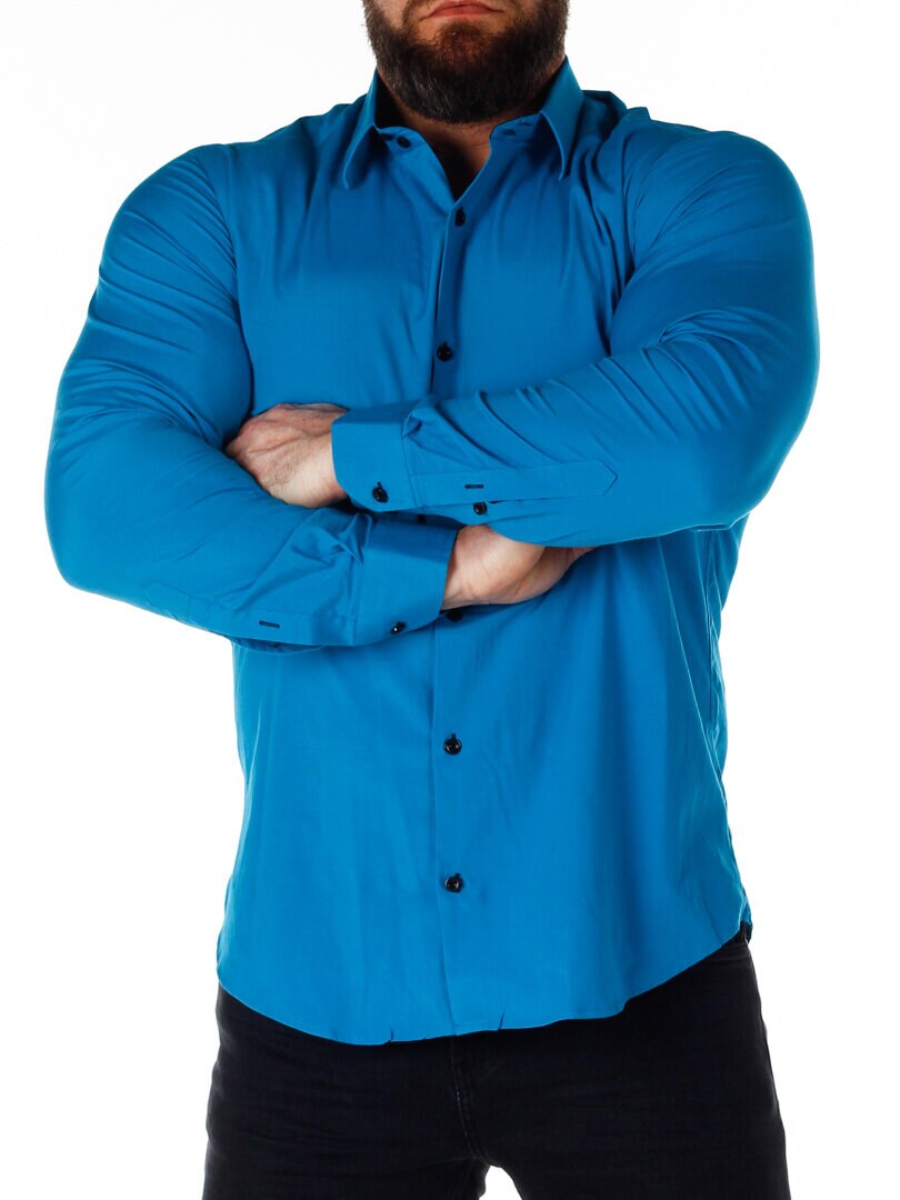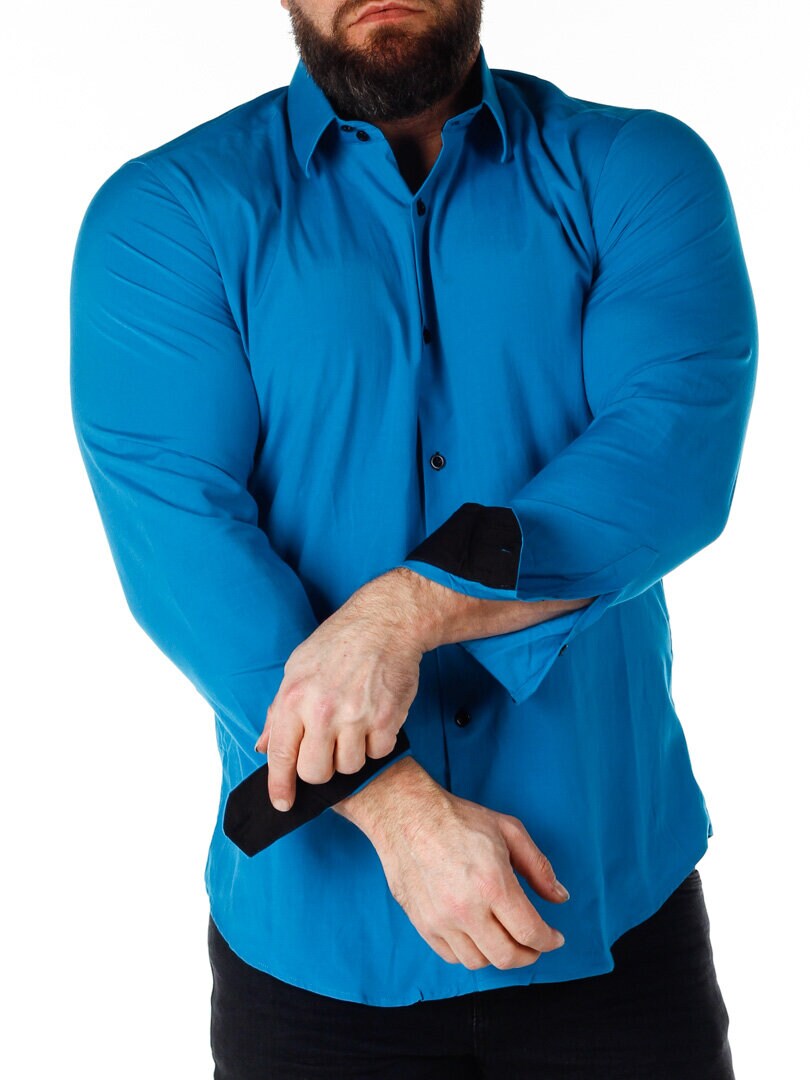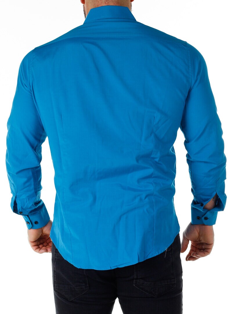 Bomullsskjorte i en behagelig modell som er lett stretchy. Blå base med knapper, innvendig krage og mansjetter i kontrastfarge. Slankere modell med avrundet linning nederst og forsterket krage som holder formen. Tilgjengelig i flere farger!