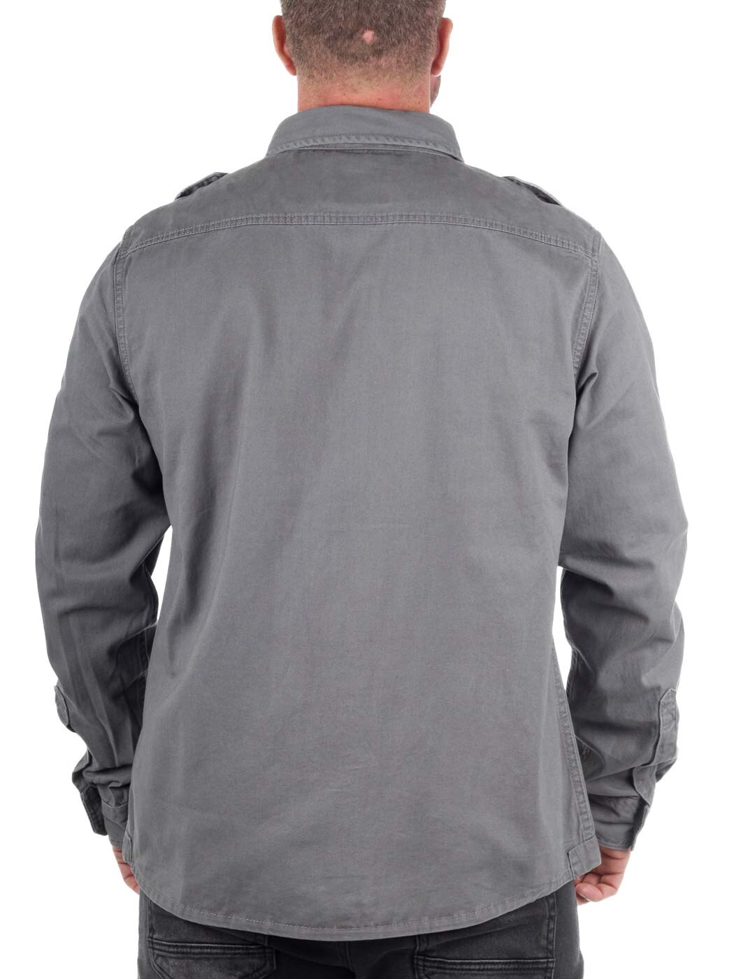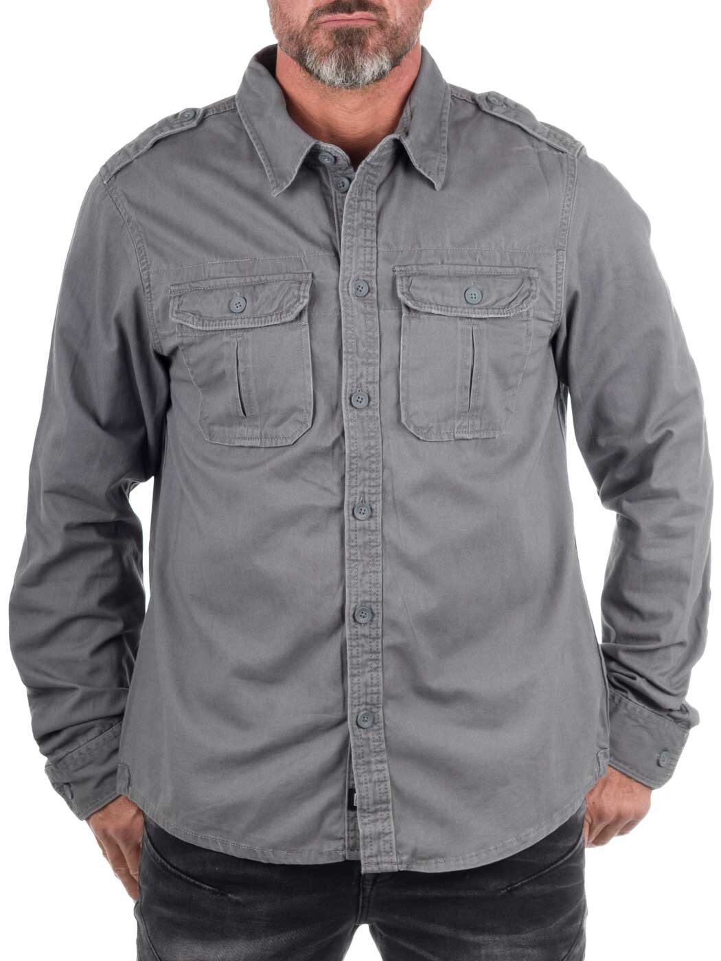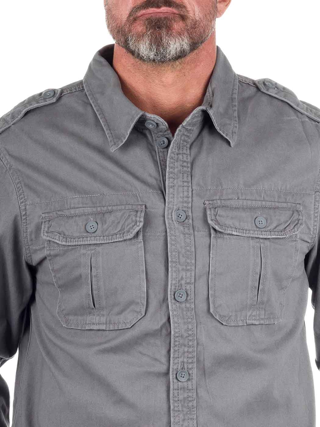 Rå skjorte i kraftig bomull med skulderklaffer, krage og brystlommer som lukkes med knapper. Detaljert med kraftige sømmer og en svart stoffpatch med logo i linningen.