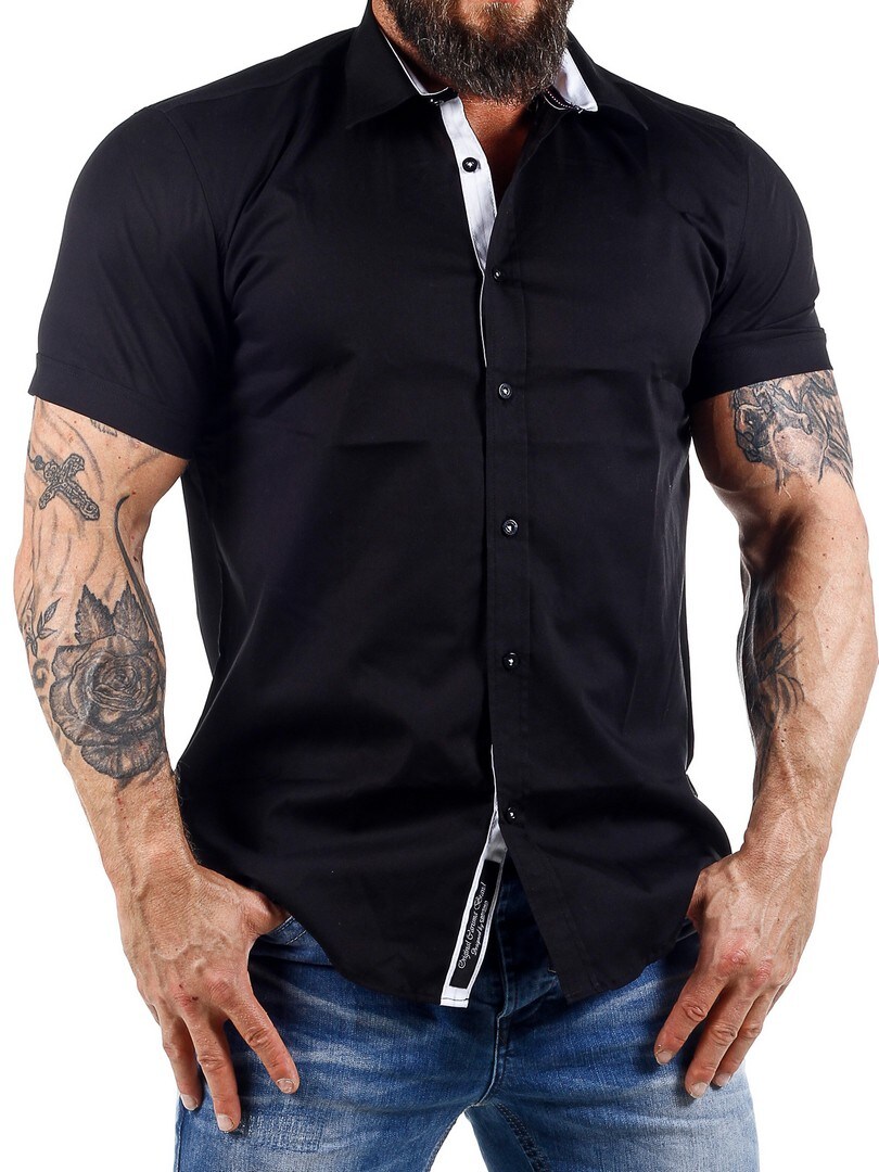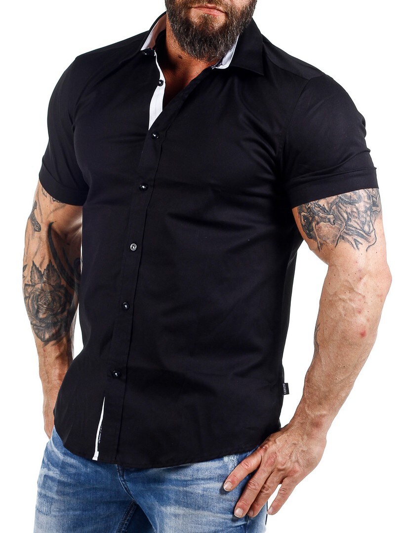 Svart skjorte med hvit kant på innsiden av kragen og på innsiden av skjorteåpningen. Hvite tråder i knappene. Dobbel kant ved ermeåpningene. En stilsikker skjorte som passer til de fleste anledninger!