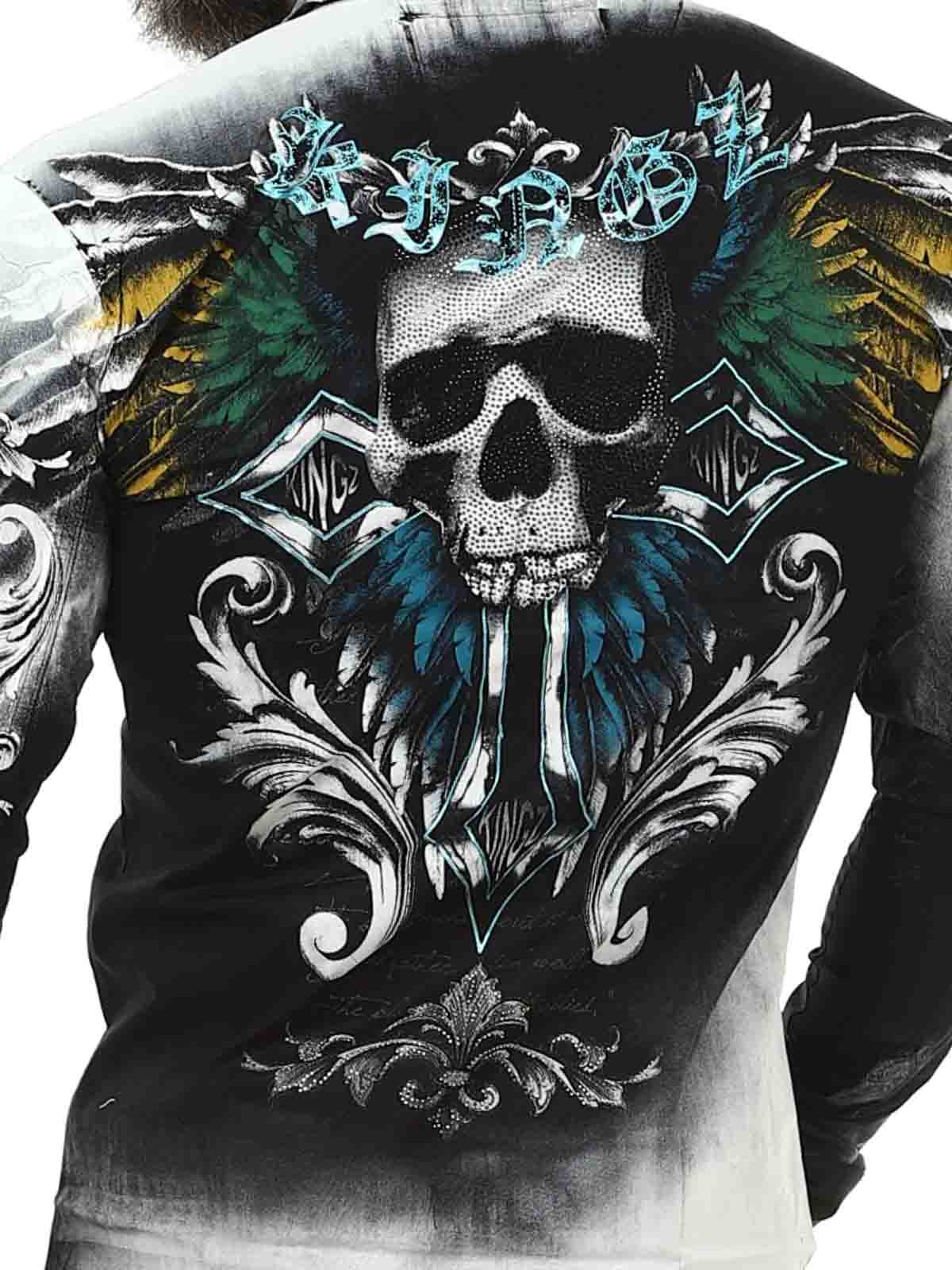 Svart skjorte med tøffe trykk i kontrastfarger og strasssteiner. Designet med solid krage, trykknapper og to brystlommer. Ermene kan brettes opp og festes med en stropp.
