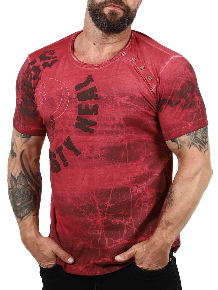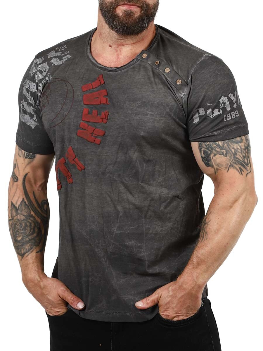Unik T-skjorte med stilige uttrykk og utseende. 3D-printet tekst i gul farge på framsiden som gir en stilig kontrast mot den sorte basisfargen. Over venstre skulder sitter det knapper som kan åpnes. Trykt motiv i grå farge på hele framsiden og ermene. Gul kontrastsøm langs sidene.