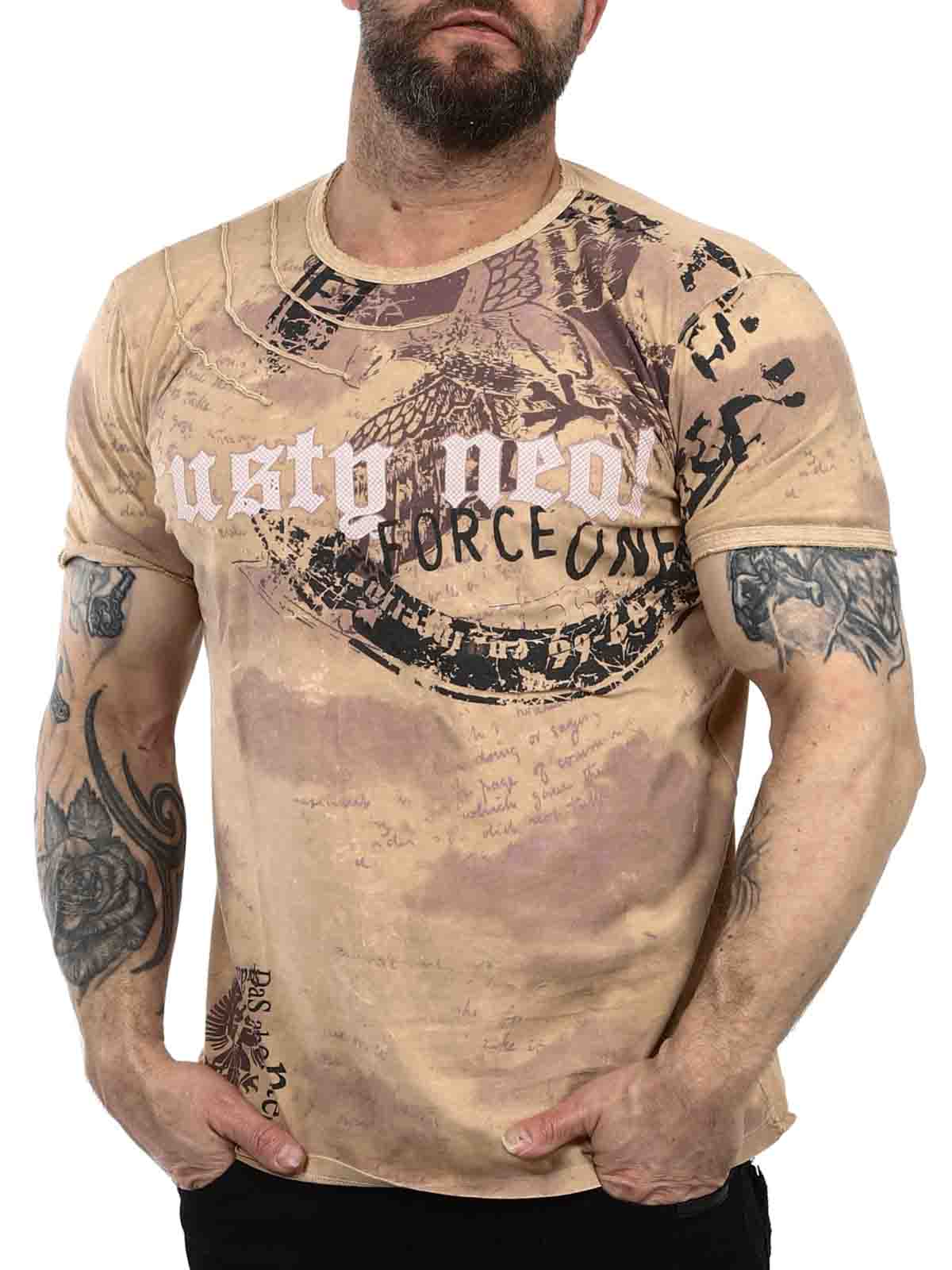 Lysegrå T-skjorte laget av 100 % bomullsmateriale. Den er rikt dekorert med mørke fargenyanser, tekstprint og røffe doble stoffkanter. Nederst foran er det en liten trekantent stoffpatchmed sort logo. Halsen er rund. Finnes i flere farger!