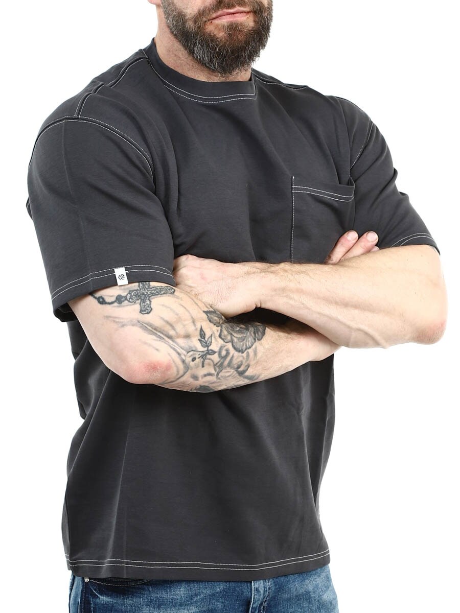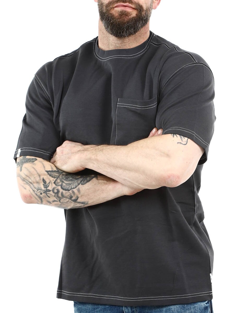 Stilren t-skjorte i klassisk passform med rund hals. Designet med markerte hvite sømmer og en åpen brystlomme. Passer like godt til hverdags som base i et mer pyntet antrekk.