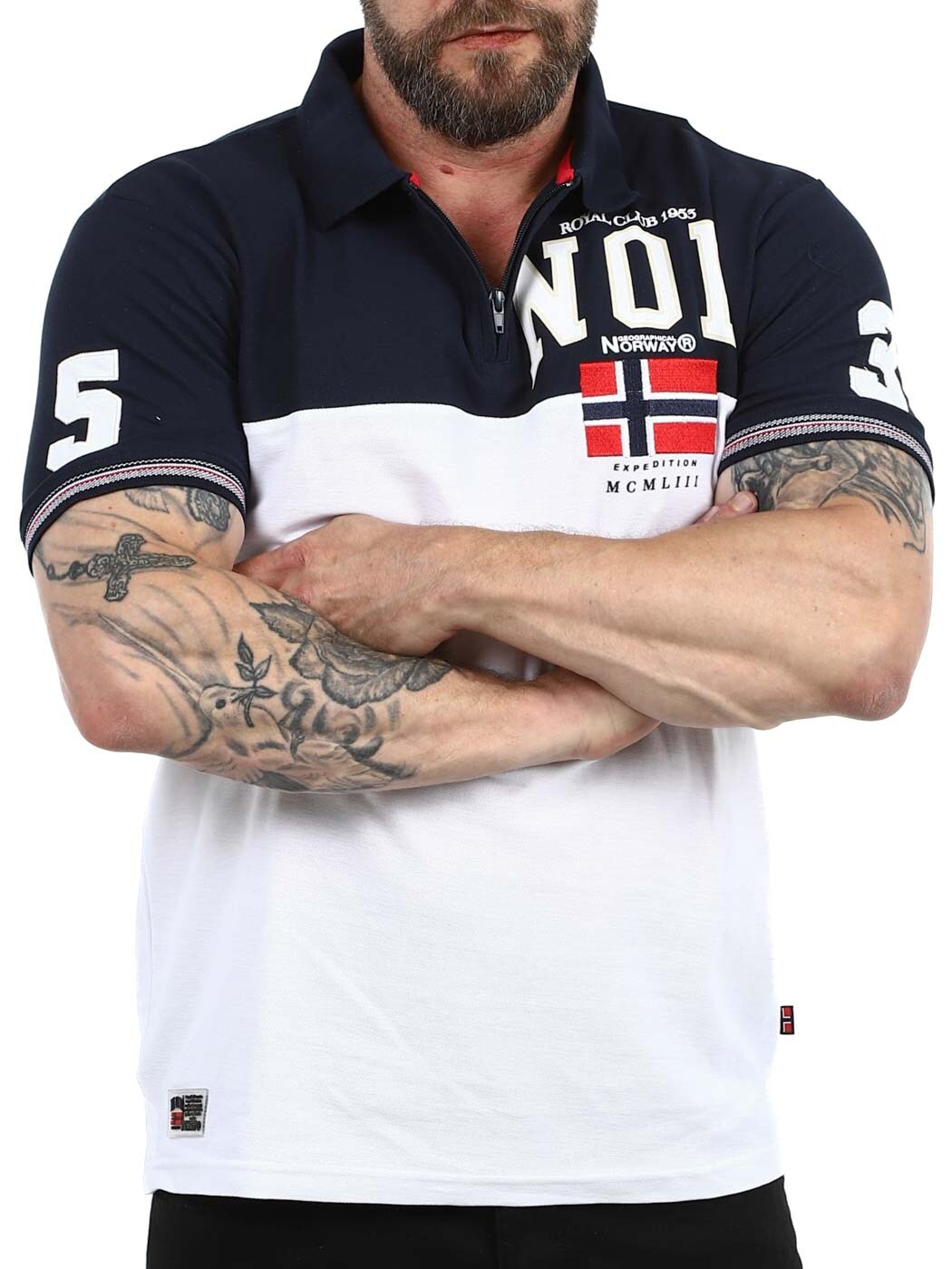 Stilig piké i hvitt og mørkeblått designet med trykk og lapper. Den har glidelås i kragen for en sporty, men stilig look og ribbestrikkede mansjetter. Laget av 100 % bomull.
