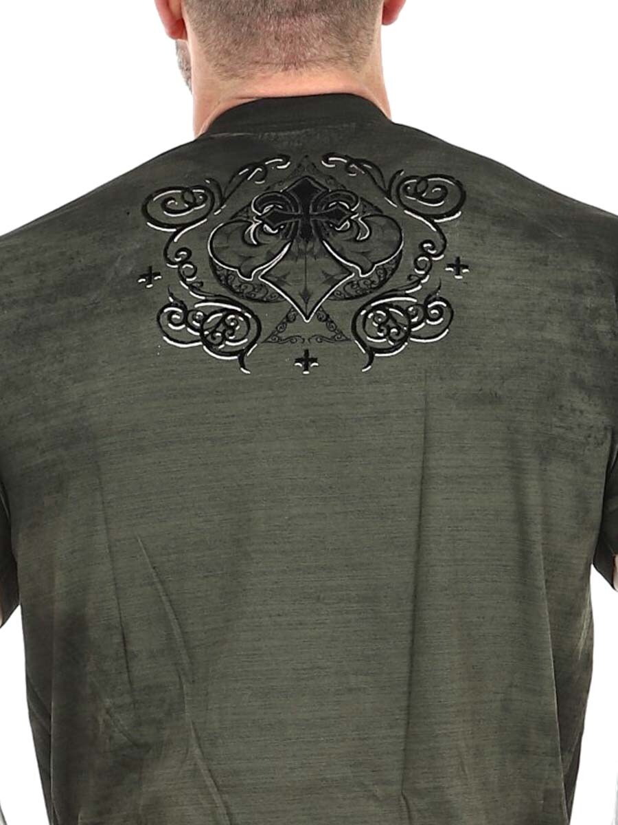 En kraftfull og detaljert t-skjorte med tydelig rock- og metalattitude. Den grønne basen har et vasket uttrykk som kompletteres av et stort, glansfullt frontmotiv med hodeskalle og logo. På baksiden finnes et mindre matchende motiv som forsterker helheten. Perfekt for deg som vil ha en t-skjorte som virkelig skiller seg ut!