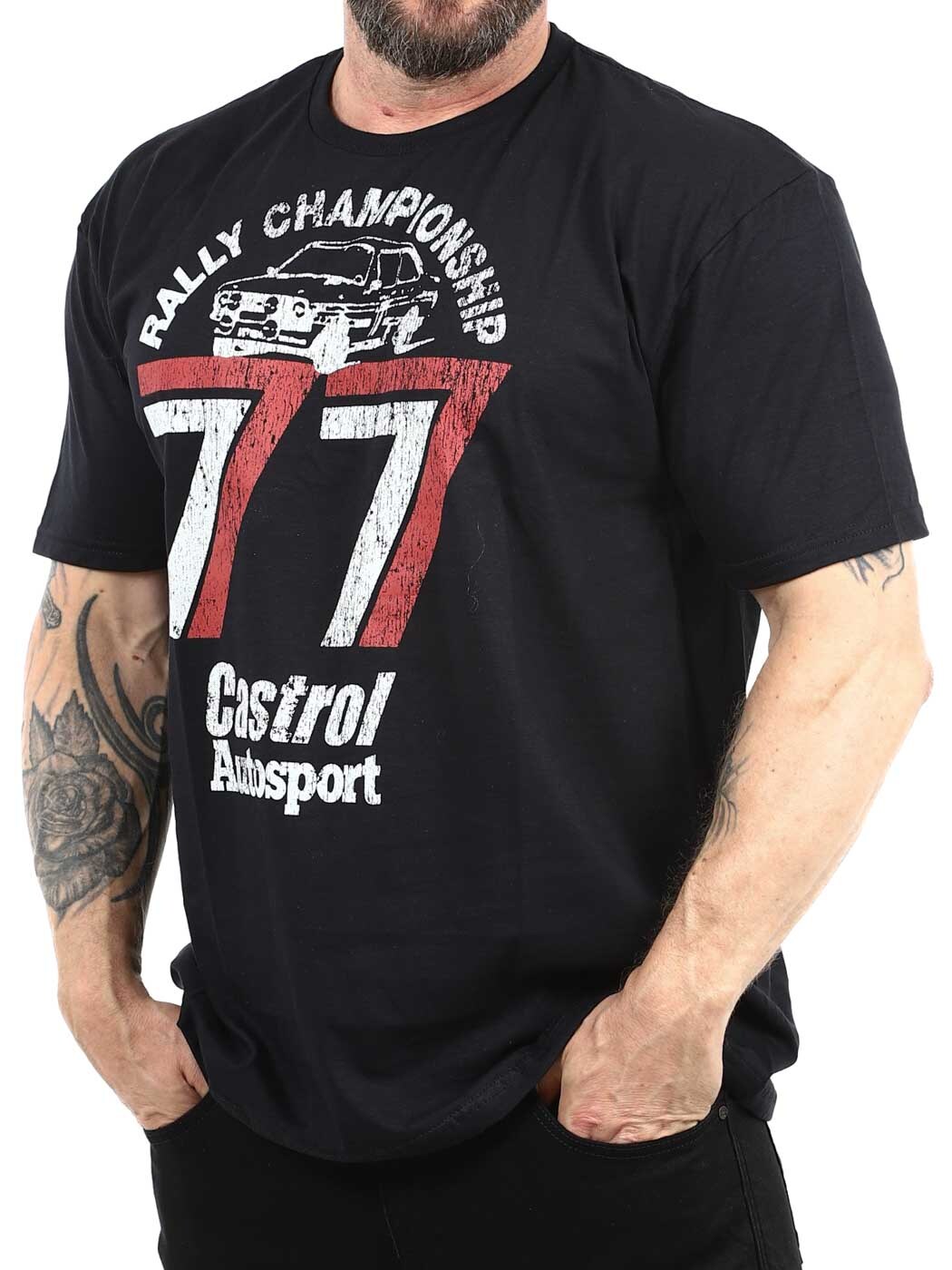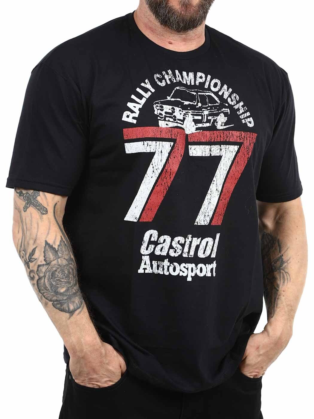 Vis din passion for motorsport med denne retroinspirerte t-skjorten. Den svarte t-skjorten har et stort fronttrykk med ordene "Rally Championship 77" og "Castrol Autosport", supplert av en klassisk rallybil i vintage-stil. Perfekt for bilentusiaster og streetwear-fans som vil ha en t-skjorte med både stil og historie.