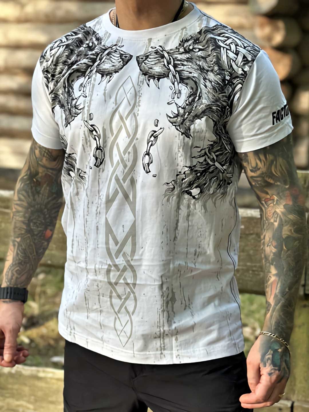 En uttrykksfull t-skjorte med store grafiske ulvemotiver, kjededetaljer og tribal-inspirerte trykk som strekker seg over både front og bakside. Perfekt for deg som liker en tøff stil og vil bruke en t-skjorte som tiltrekker seg oppmerksomhet.