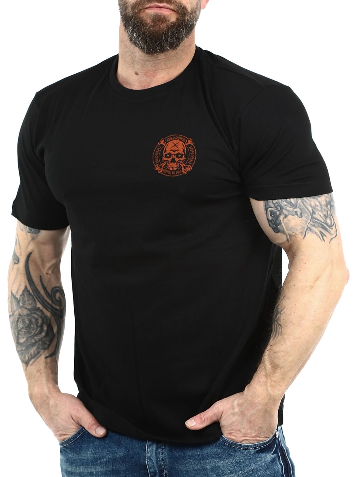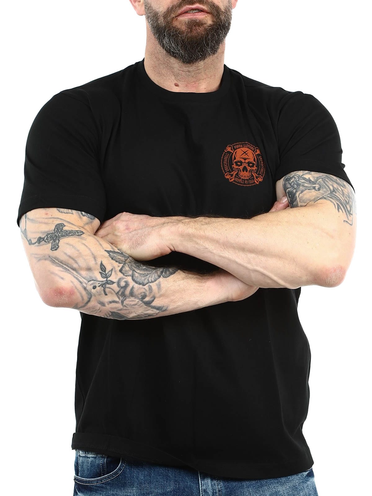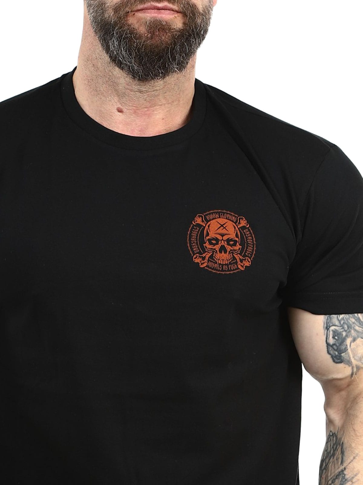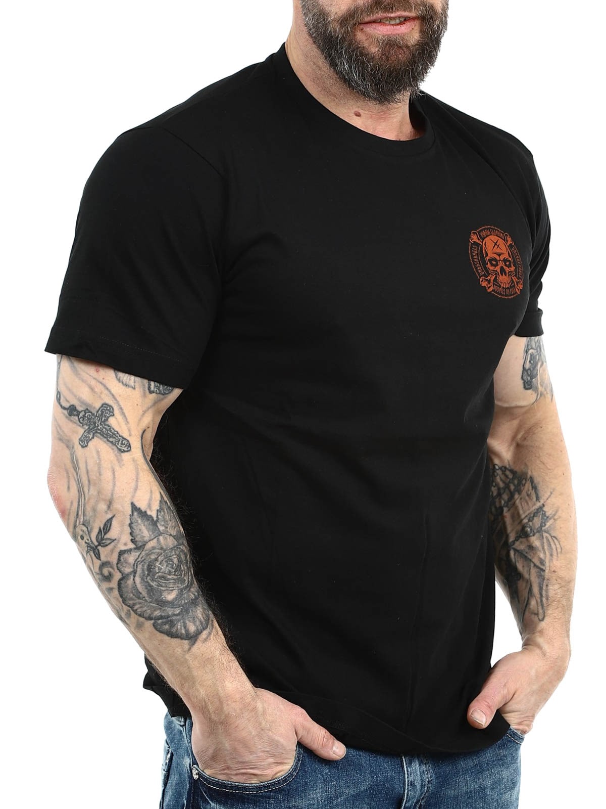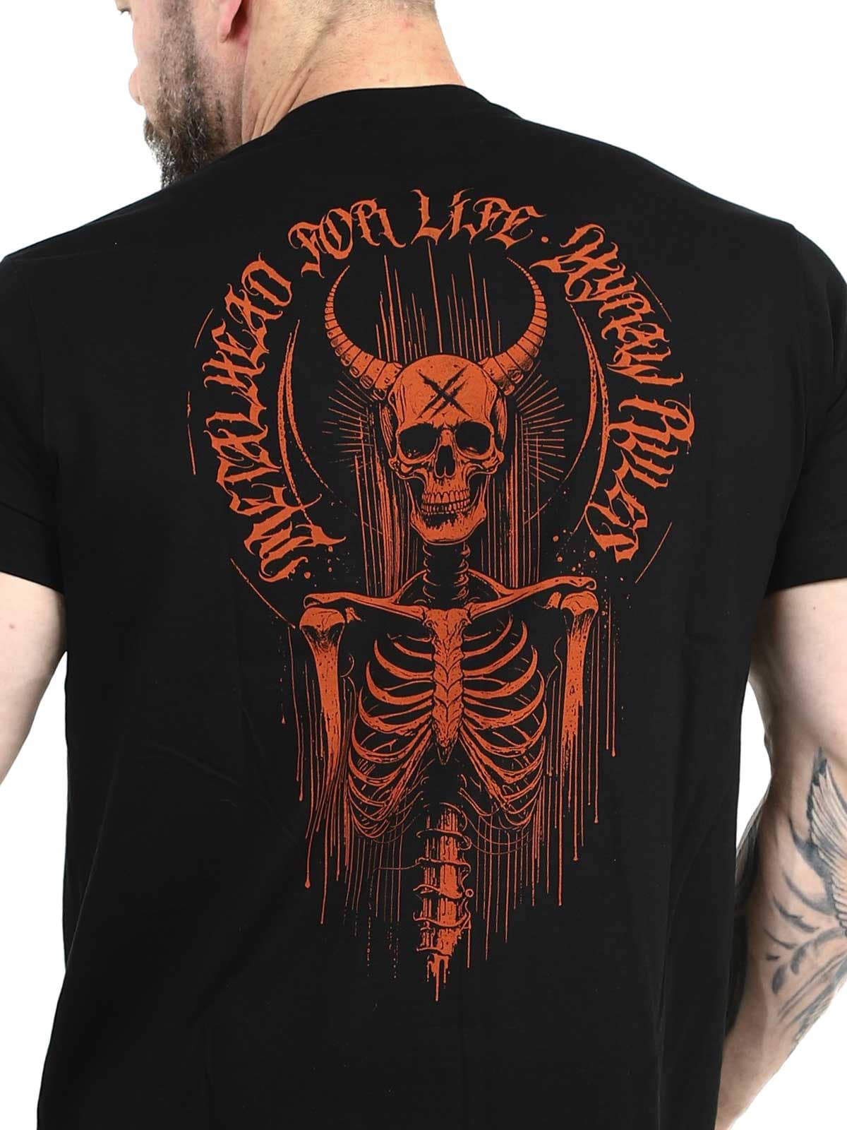 Svart t-skjorte designet med stort trykk bak og mindre trykk foran. Rett modell med avrundet og ribbet hals. Produsert i 100% bomull!