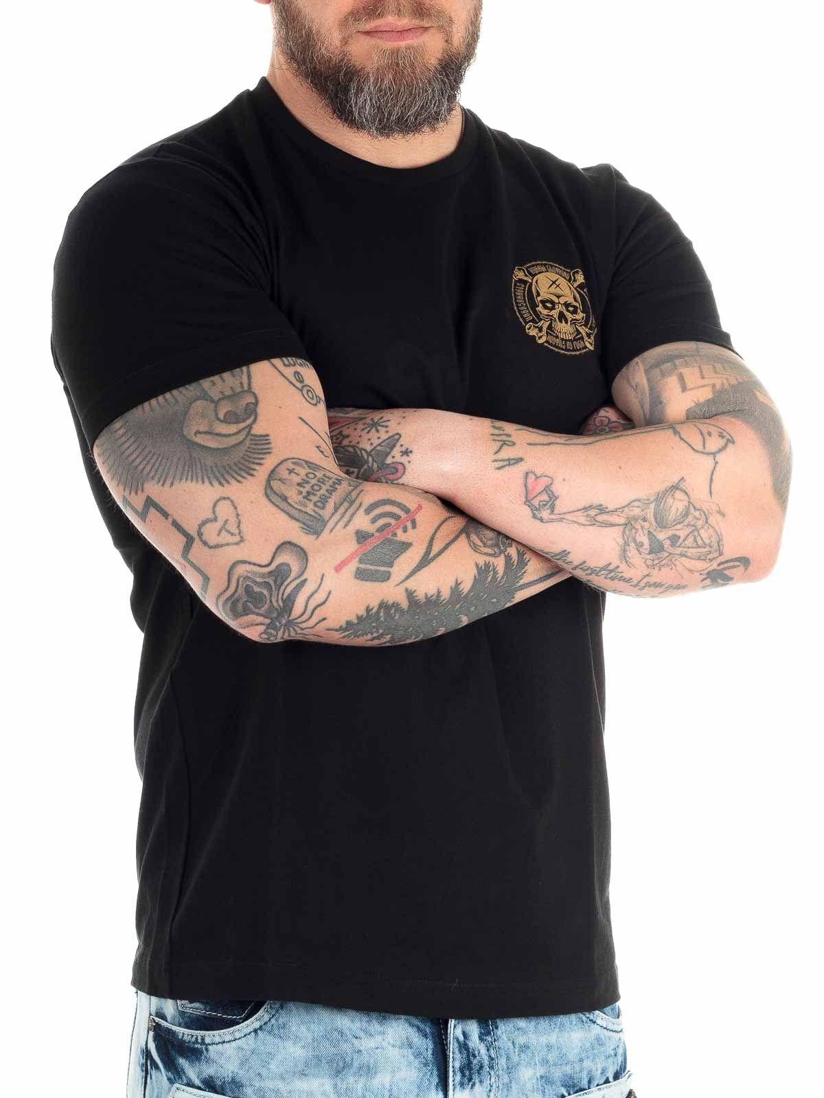 Svart t-skjorte designet med stort trykk bak og mindre trykk foran. Rett modell med avrundet og ribbet hals. Produsert i 100% bomull!