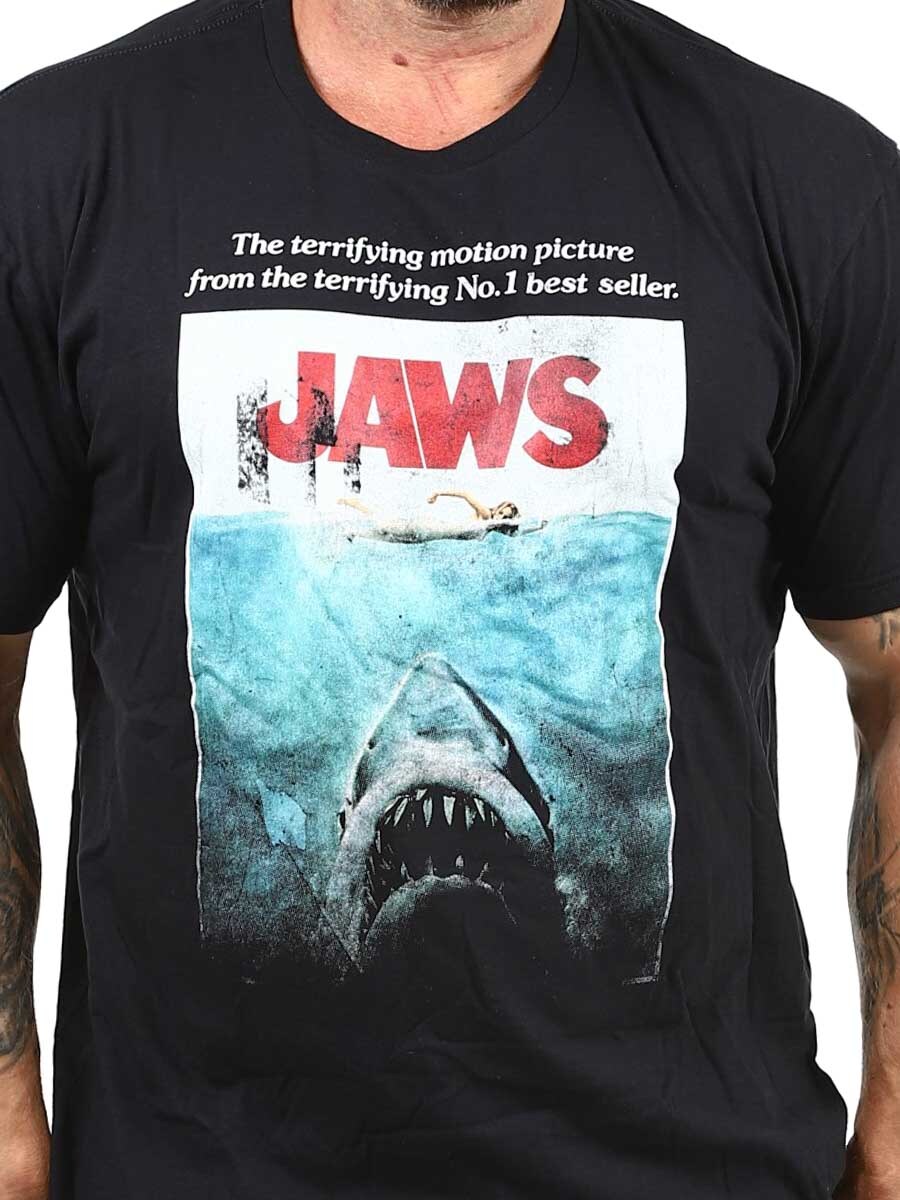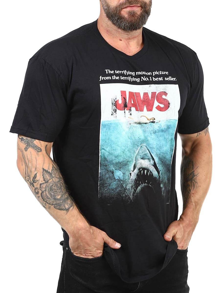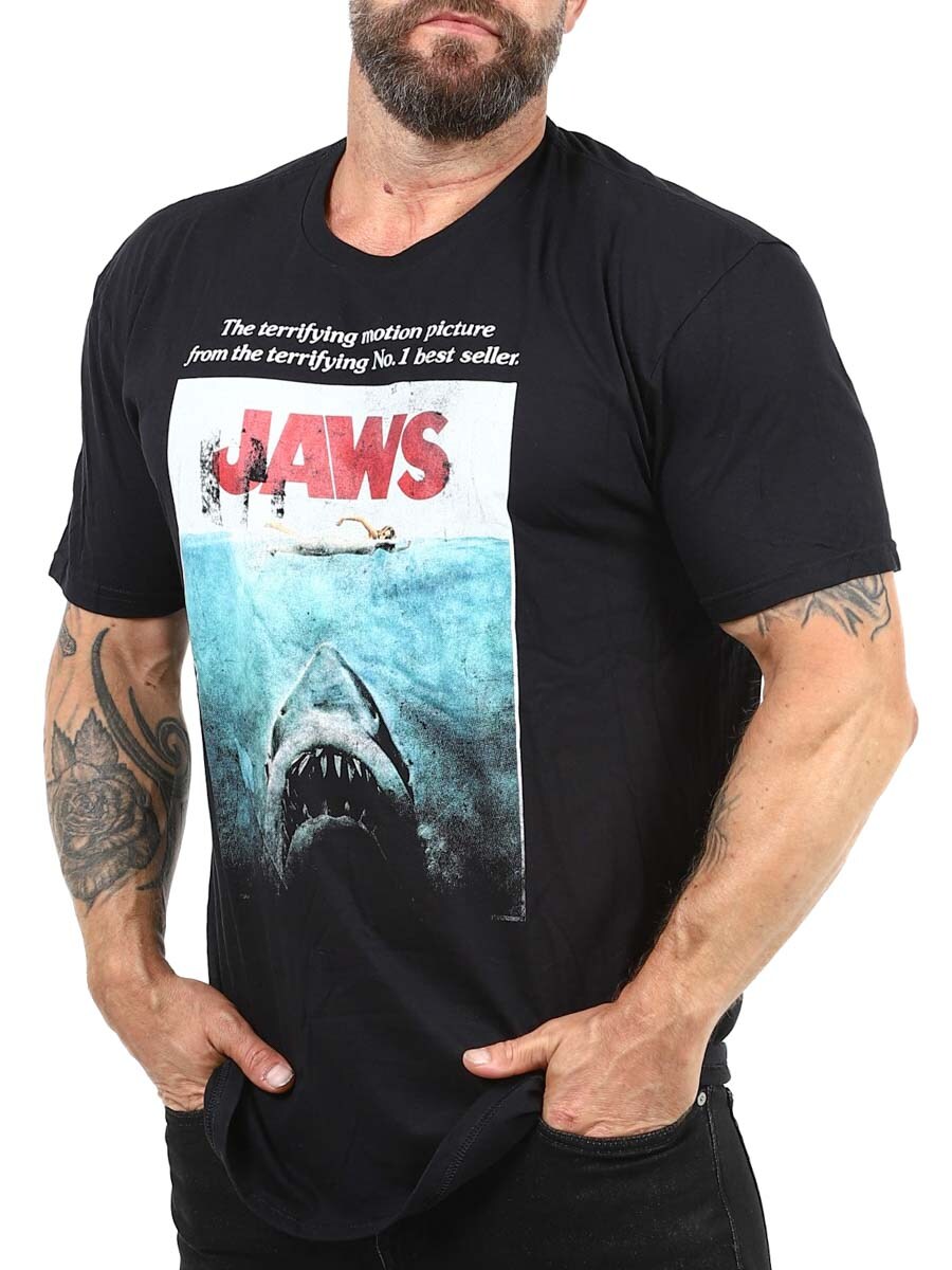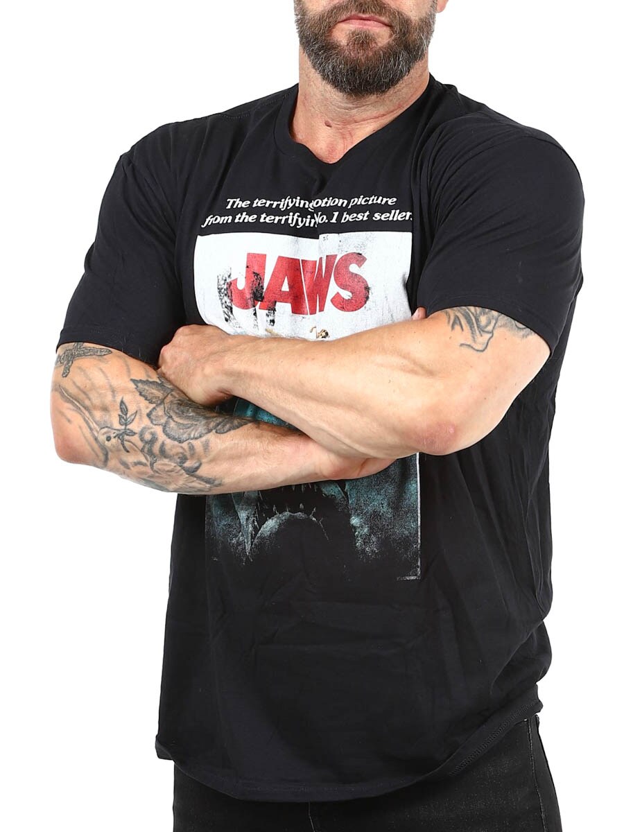 Stilig t-skjorte designet med JAWS-trykk på forsiden. Med sin klassiske plakatgrafikk fra Steven Spielbergs skrekkfilmklassiker er denne t-skjorten et must for filmelskere og retrofans.
