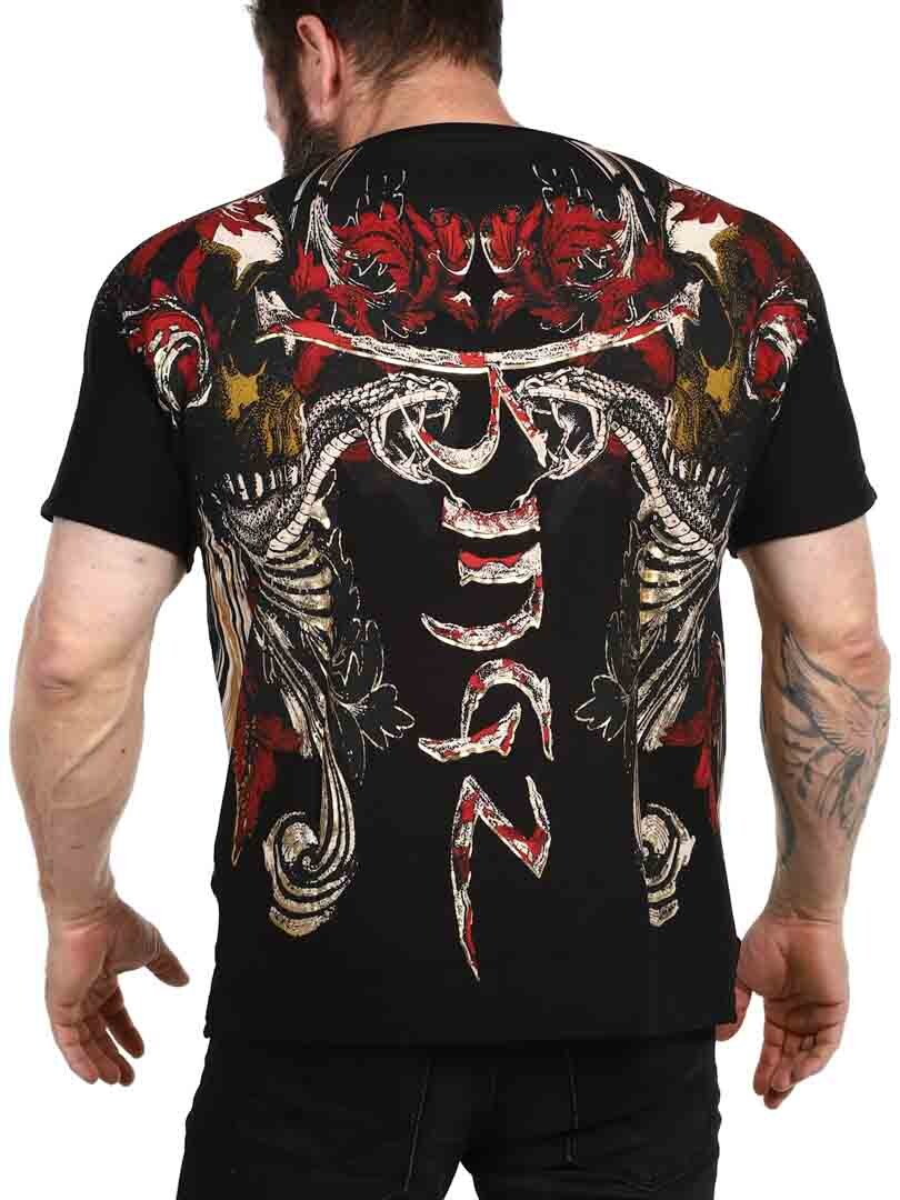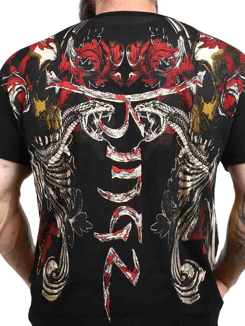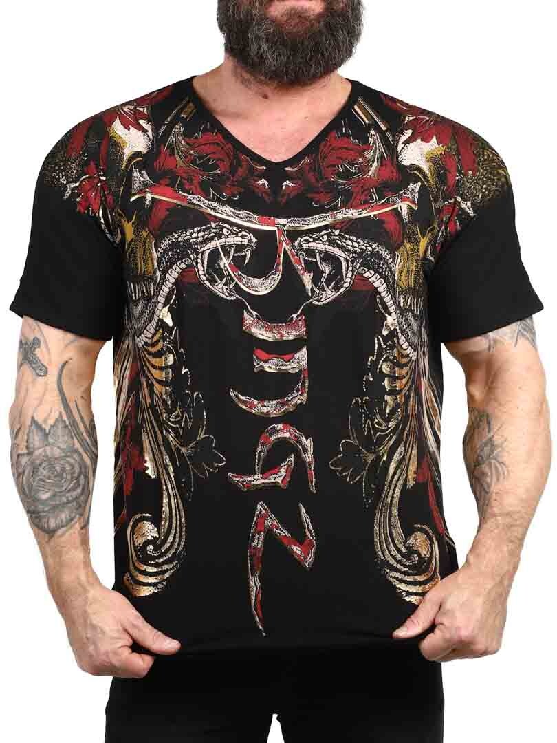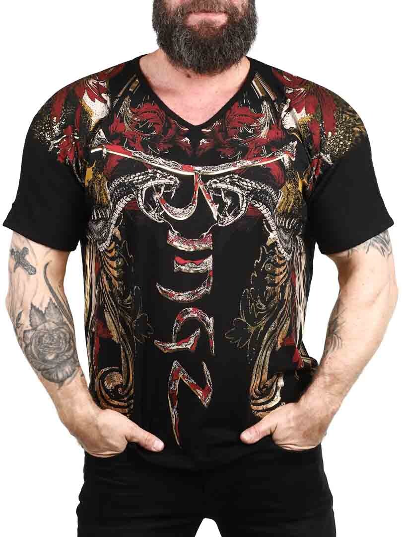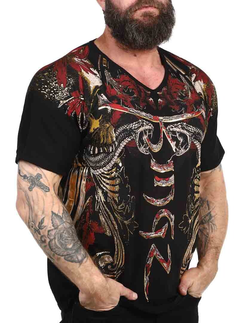 T-shirt med et dristigt og udtryksfuldt design, der er perfekt til dem, der ønsker at gøre et stærkt indtryk. Med et detaljeret tryk, der blander dødningehoveder, slanger og dynamiske mønstre i rød, guld og sort, får skjorten et rebelsk og kunstnerisk præg. Den er fremstillet af en elastisk bomuld med en v-udskæring. Den er et oplagt valg for dem, der ønsker et unikt look med attitude!