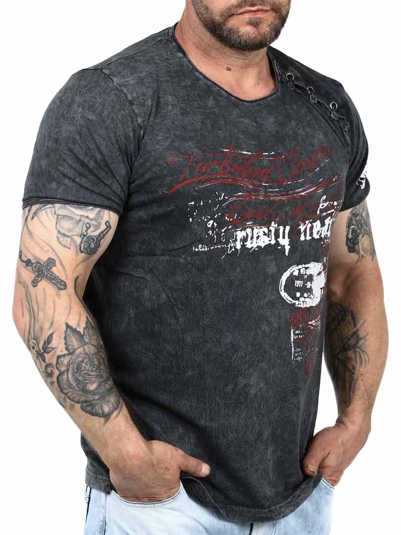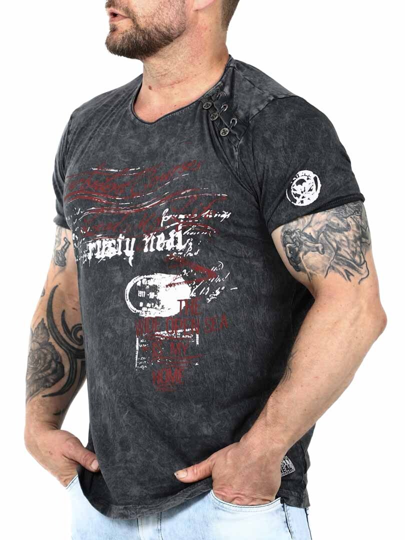 Grå t-skjorte med rødt og hvitt trykk fra Rusty Neal