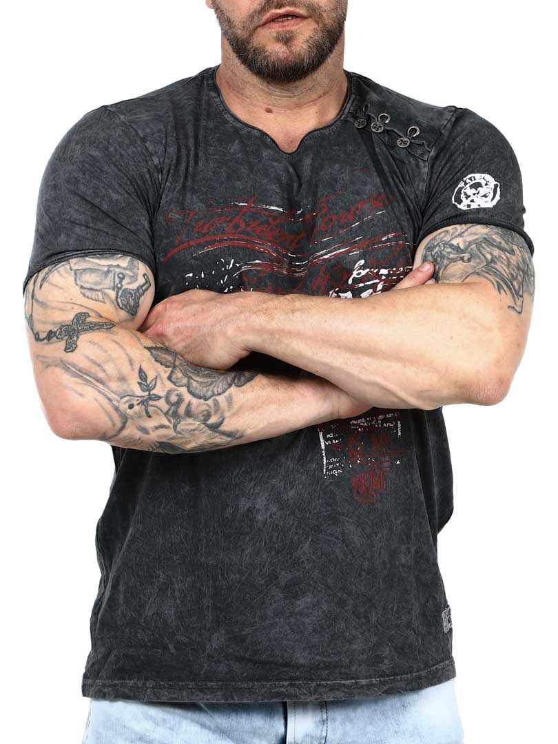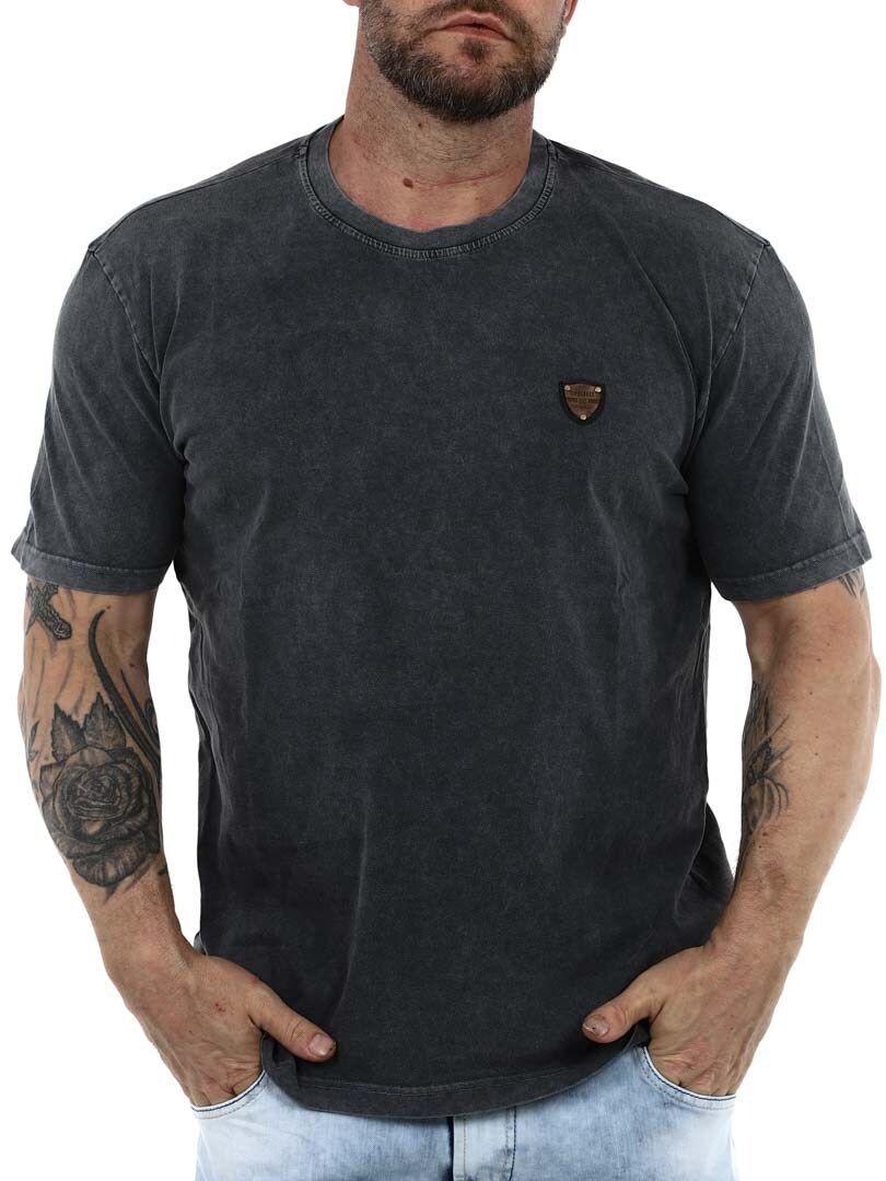 Produsert i en klassisk passform med stretchy bomull og rund hals. Stort trykk foran og skuldermarkering med sølvfargede metallknapper. Utvasket, trendy design og logo nederst.