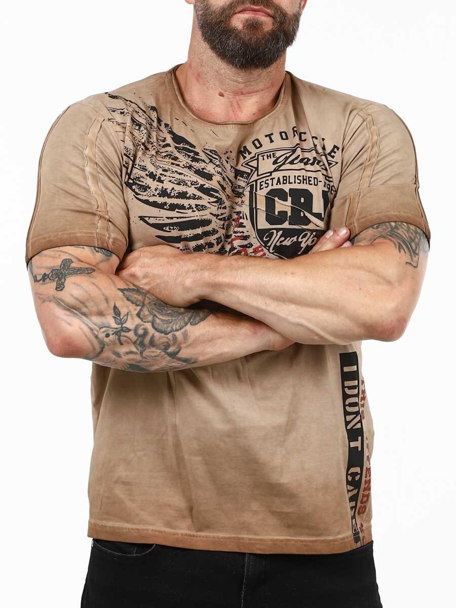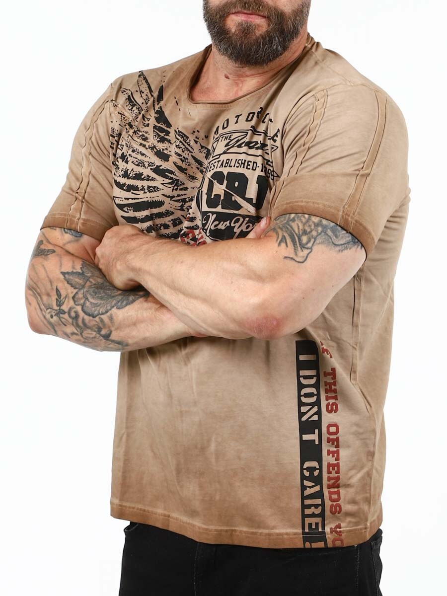 Stilig t-skjorte med avrundet halsåpning som har rå kanter. Designet med et dristig trykk som utstråler en selvsikker stil og rebelsk holdning. Laget av et mykt og elastisk materiale.