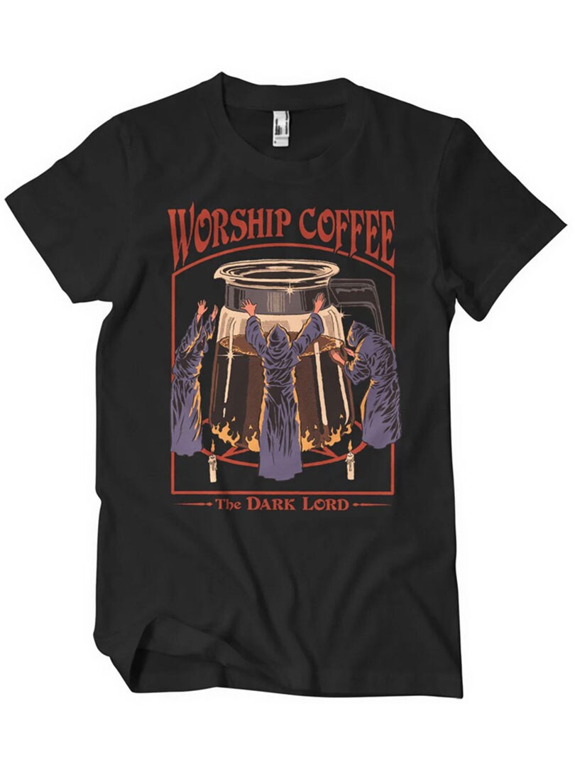 Svart T-skjorte med trykk på forsiden og teksten Worship Coffee. Et lekent mørkt design som passer perfekt for kaffeelskere med humor. T-skjorten har klassisk passform og rund hals for god komfort i hverdagen.