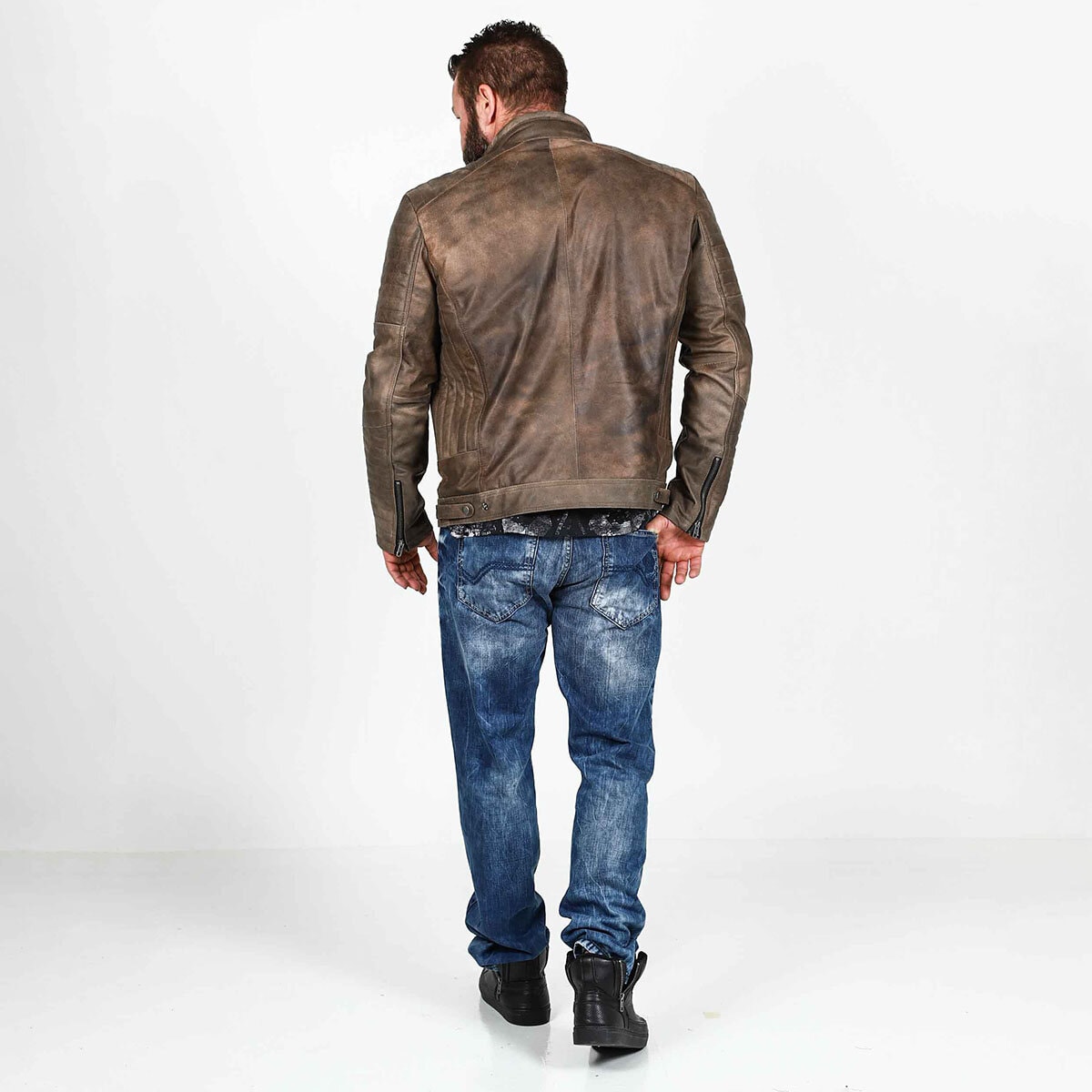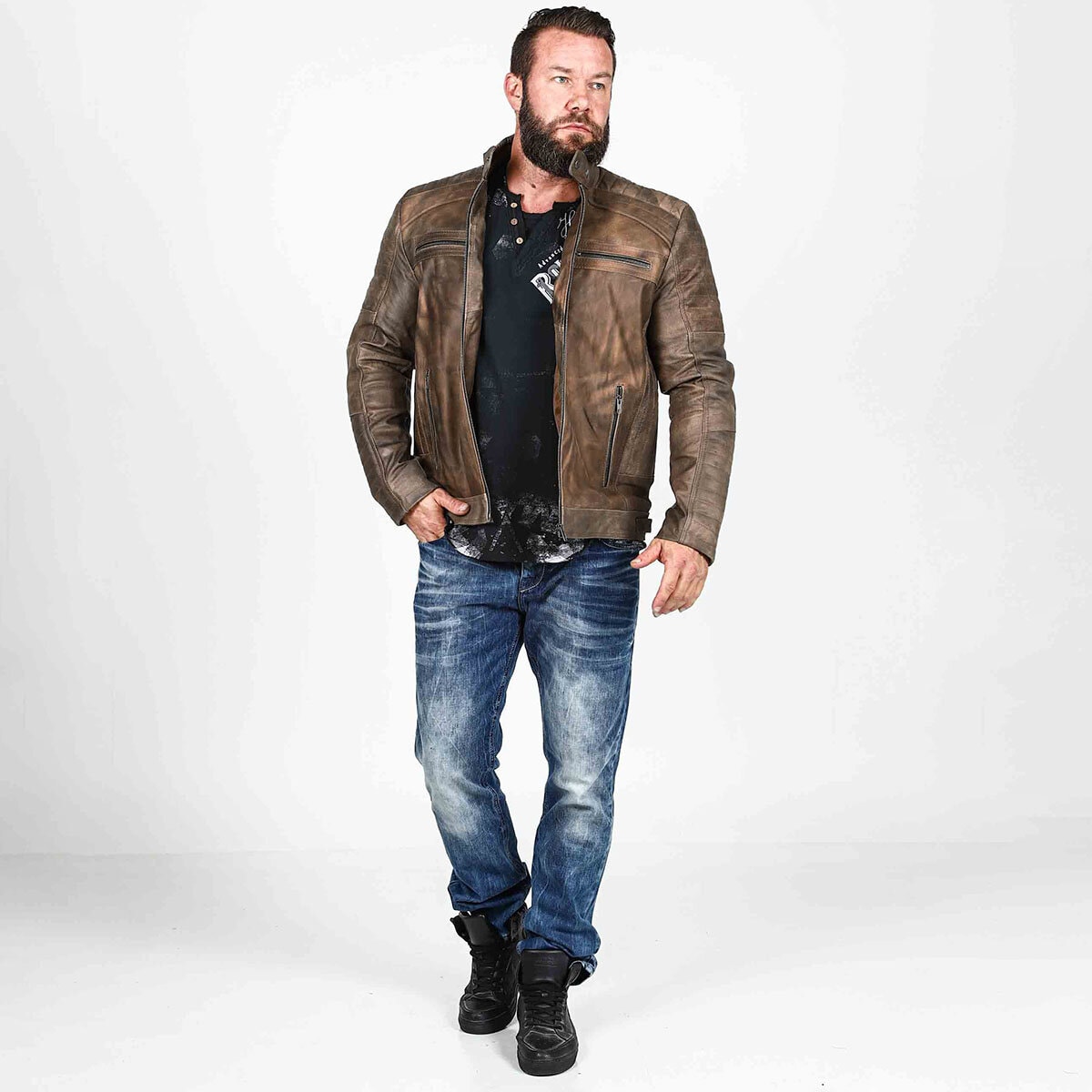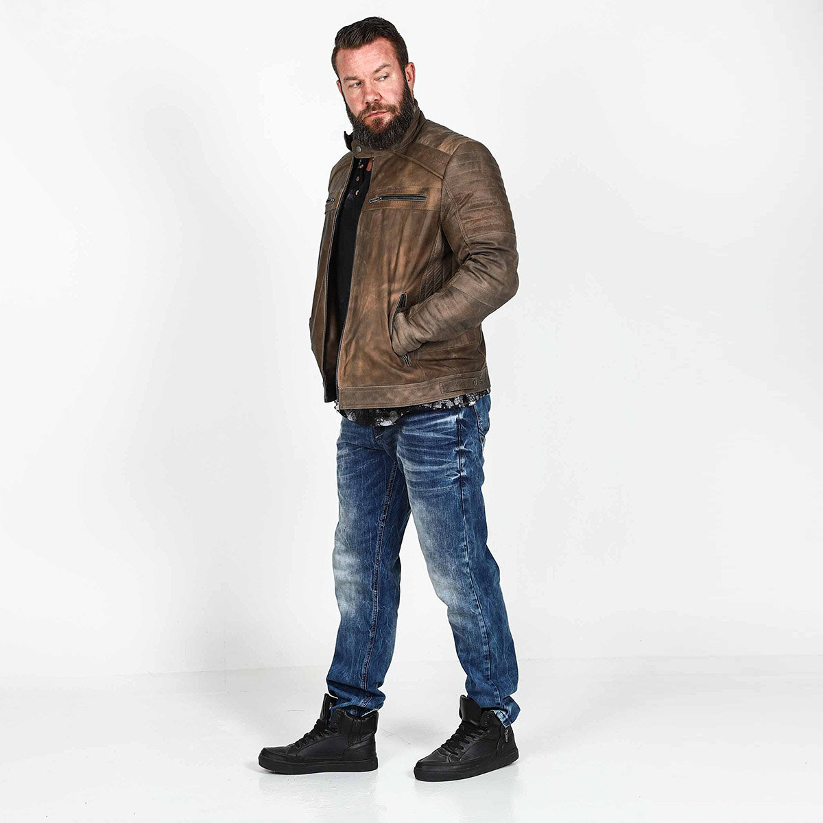 Er du på jakt etter en stil som balanserer det avslappede med det tøffe? Denne kombinasjonen er svaret. Her møter klassisk biker-estetikk moderne, urbane detaljer. Dette er looken for mannen som setter pris på kvalitet og vil ha klær som bare blir finere med årene.